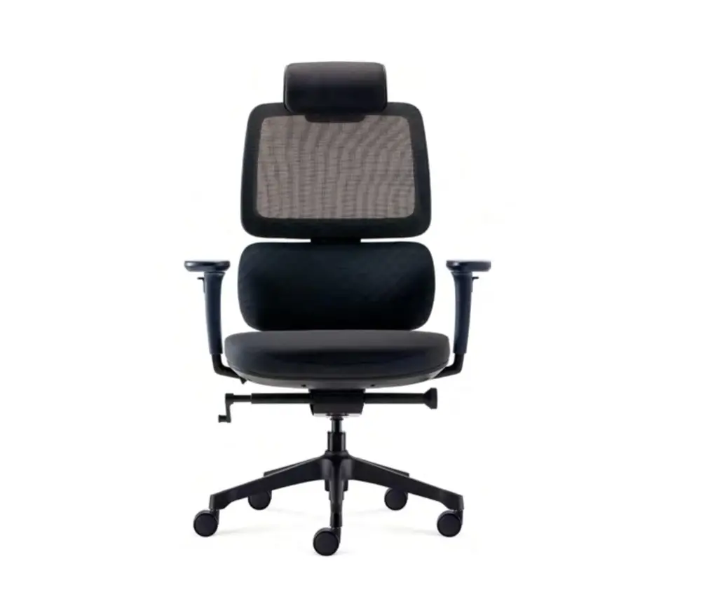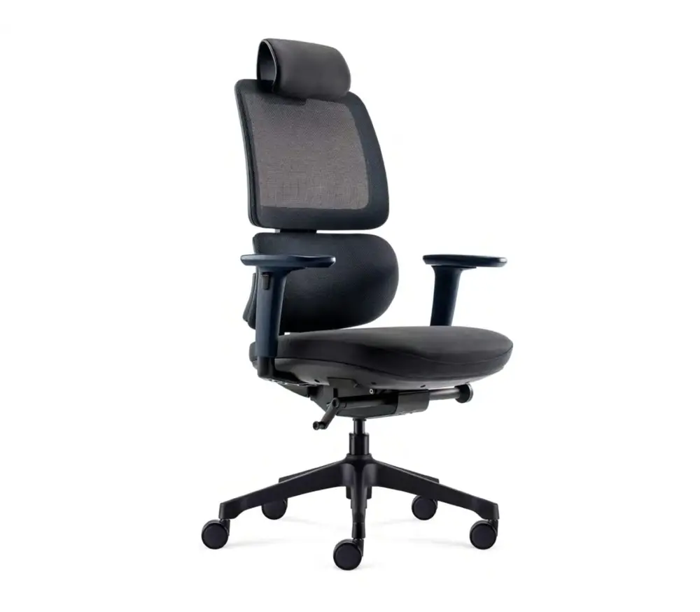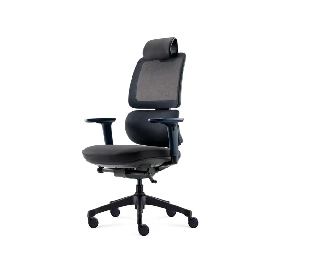 - Spécifications: mécanisme synchrone verrouillable, dossier en tissu résille et tissu, assise réglable, support lombaire, accoudoirs 3D, assise avec dossier haut en 3 parties (dossier résille en 2 parties, réglable en hauteur avec crémaillère), assise en tissu noir avec mousse, pression réglable avec levier en fonction du poids de l'utilisateur