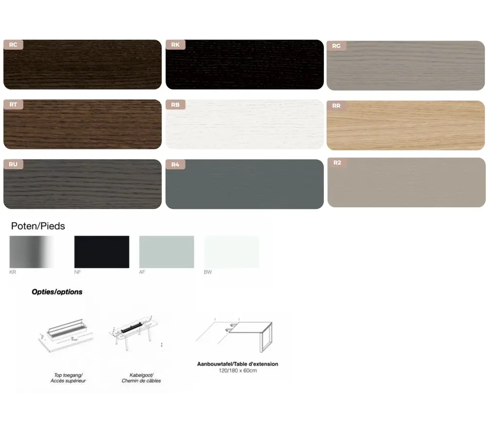 De plus, les plans de travail sont laqués avec une sorte de peinture polyester antireflet et séchés au four avec un système UV. Les pieds étaient constitués de quatre tubes en acier étiré (brossé) soudés ensemble.Pour agrandir encore ce bureau design, vous pouvez opter pour une table rallonge de 120 x 60 et 180 x 60 cm. Vous pouvez également fournir à ces tables en bois de Bralco un accès supérieur avec prises, accès téléphonique et accès CPU.