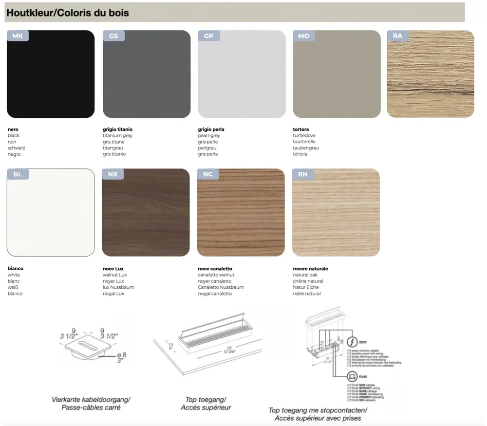 - En option: plateau passe-câbles et panier à câbles sous le bureau. Vous pouvez également obtenir des cloisons de séparation sur demande