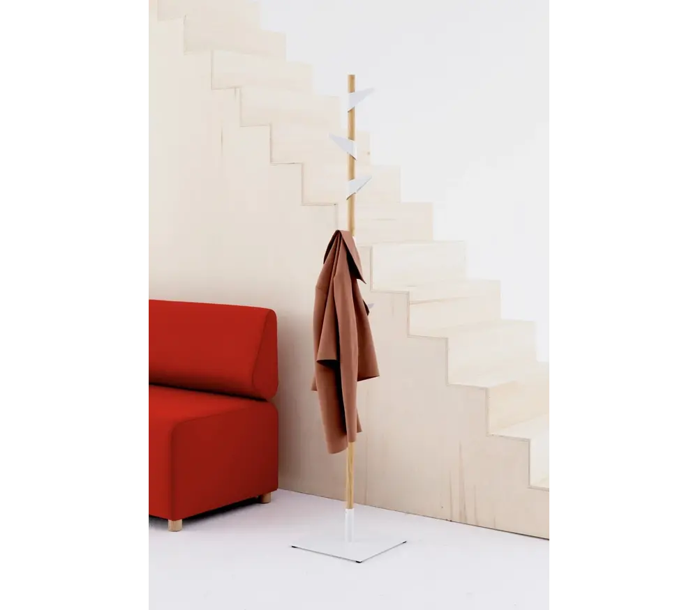 Le Cascando Bamboo 1 porte-manteau debout est disponible en bambou avec des crochets en métal blanc.