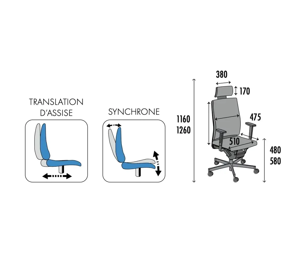 - Caractéristiques techniques : Dossier en maille avec support lombaire à 6 positions, réglable sur 5 cm, Appuie-tête réglable sur 11 positions sur 9,5 cm, Accoudoirs 3D avec coussins en polyuréthane, Mécanisme synchrone verrouillable sur 4 positions, Réglage de la tension en fonction du poids de l'utilisateur, Profondeur d'assise réglabl