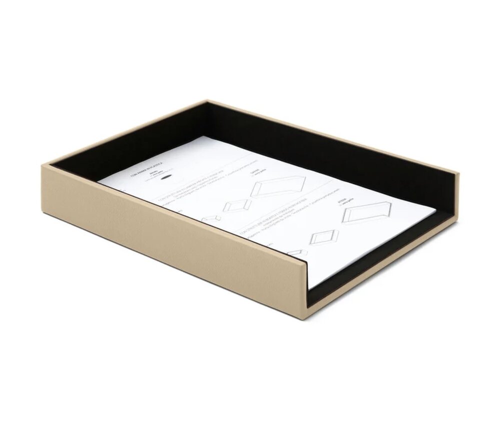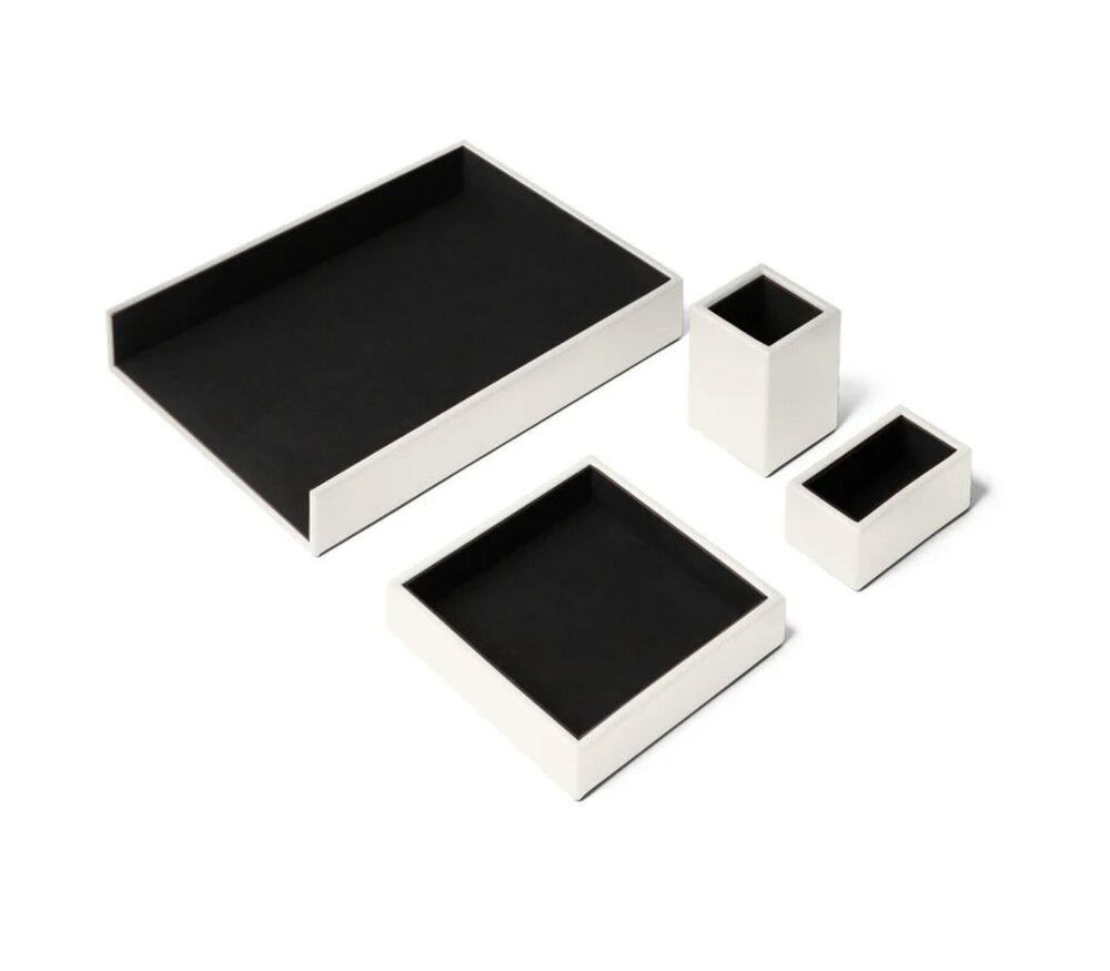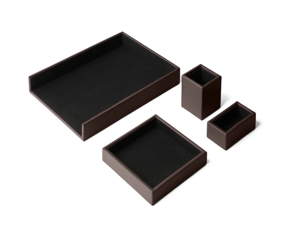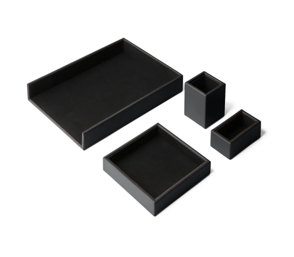 Il comprend un vide-poches, un pot à crayons, un bac à courrier et un porte-cartes de visite. Son design aux lignes carrées et son attention minutieuse aux détails témoignent d’un savoir-faire artisanal d’exception.