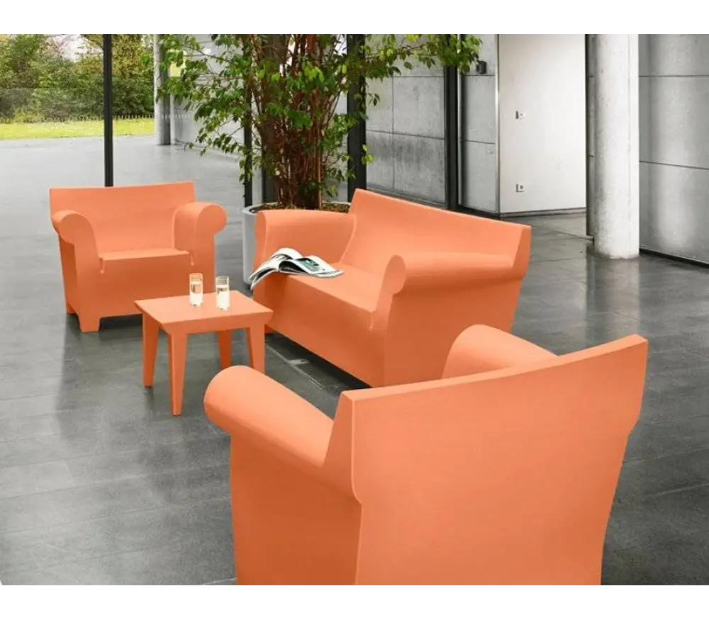 Les formes des meubles Bubble Club en polyéthylène résistant teint dans la masse n’ont rien de massif afin de pouvoir les transporter aisément. Grâce au savoir-faire technique de Kartell et à un travail intensif de recherche Design, il est désormais possible de produire en série des objets qui ne pouvaient être fabriqués jusqu’alors que de manière artisanale. Cette prouesse a été récompensée par le Compasso d’Oro, qui est le plus prestigieux prix de Design italien. L’esthétique du canapé deux places et du fauteuil Bubble Club joue sur le contraste entre les accoudoirs arrondis et la ligne droite du dossier. Complétée par la table basse, la série de meubles Bubble Club offre un très bel exemple de « mobilier de salon industriel ». Nous vous proposons les meubles Bubble Club dans cinq coloris différents. De plus, les matériaux sont résistants aux intempéries, ce qui permet d’utiliser les meubles Bubble Club en plein air également!