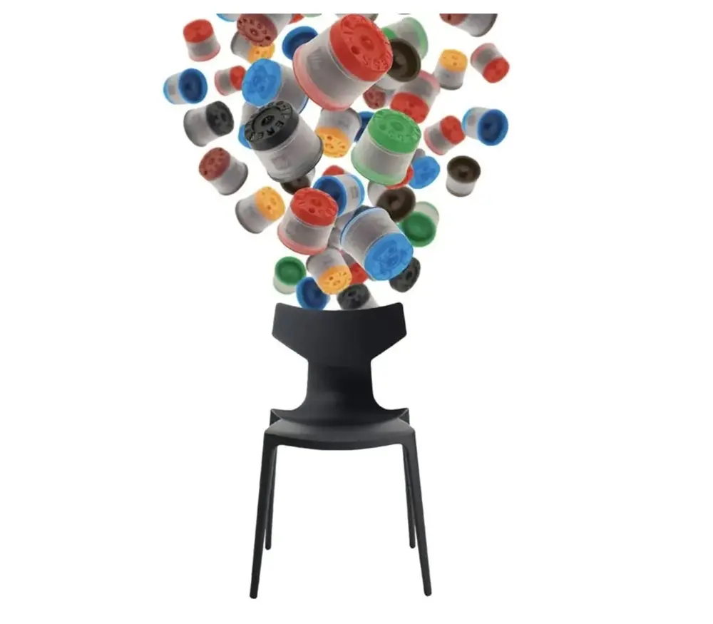 La Re-Chair est fabriquée en technopolymère thermoplastique 100 % recyclé. La matière première provient de déchets postindustriels, notamment des capsules de café Illy. Celles-ci sont broyées puis transformées en granulés, constituant une « seconde matière » injectée dans les moules Kartell afin de donner naissance à un nouveau produit design. Le matériau utilisé est pur et non contaminé par d’autres composants.