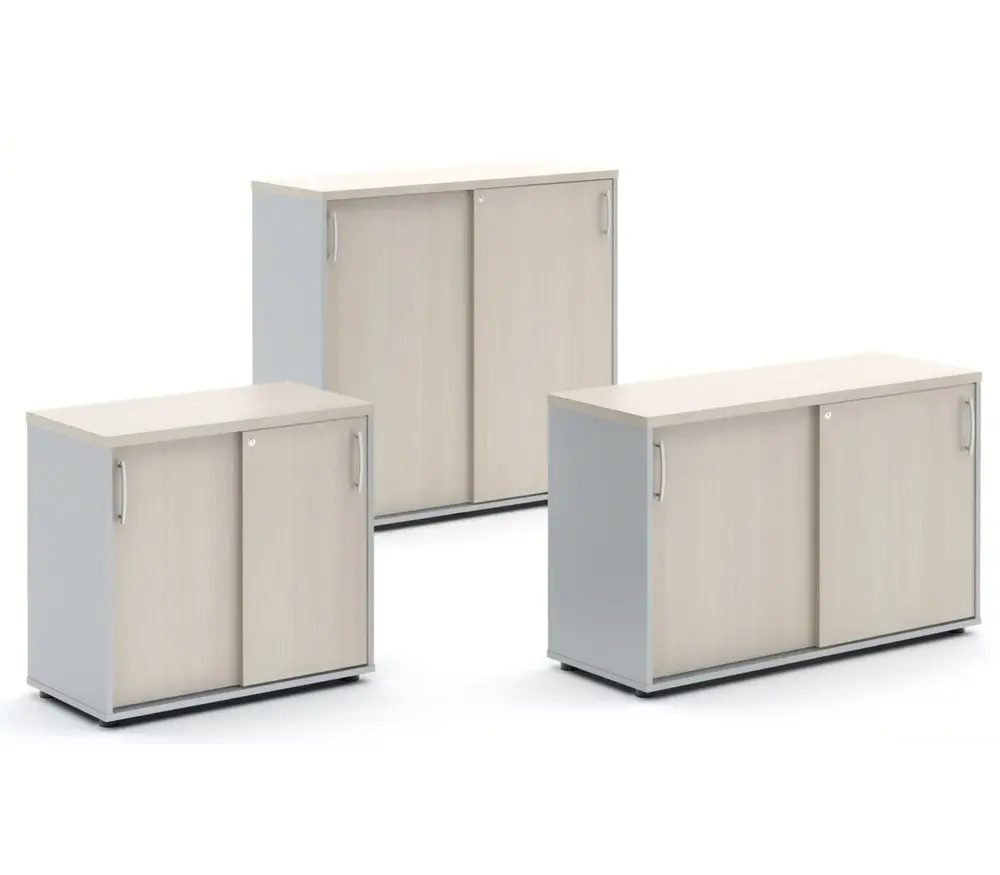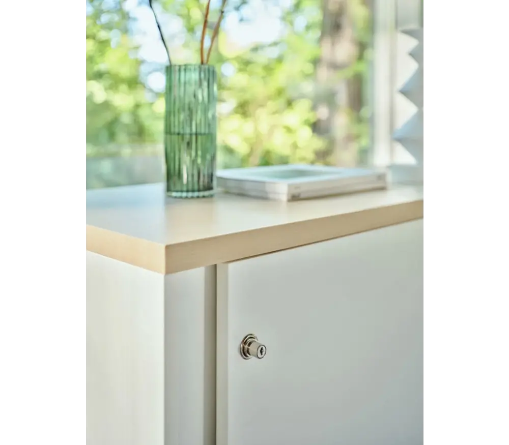 L'armoire à volets MDD est disponible en neuf couleurs différentes : Chêne, Blanc, Beige, Bouleau, Cacao, Noyer, Hêtre, Anthracite et Aluminium. Vous avez également la possibilité de personnaliser la couleur des volets, afin que l'armoire s'intègre parfaitement à l'agencement de votre bureau. Les volets glissent avec fluidité grâce aux rails en aluminium, garantissant une grande durabilité et une utilisation facile.