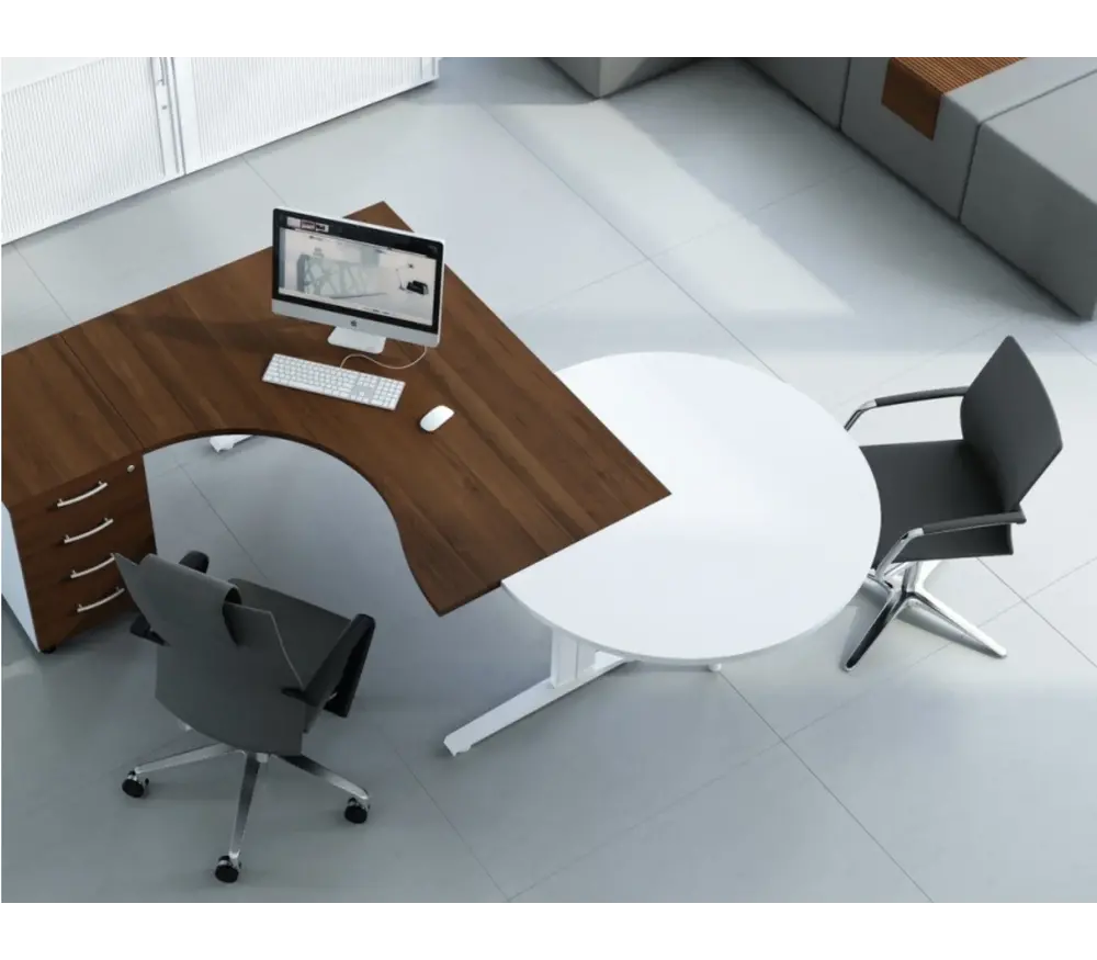 Le bureau peut être complété par une table ronde de réunion (« goutte de réunion ») de 120 cm, idéale pour des réunions informelles ou des échanges rapides au poste de travail. Après la commande, vous serez contacté afin de confirmer la couleur de cette table, qui peut être choisie indépendamment du bureau.