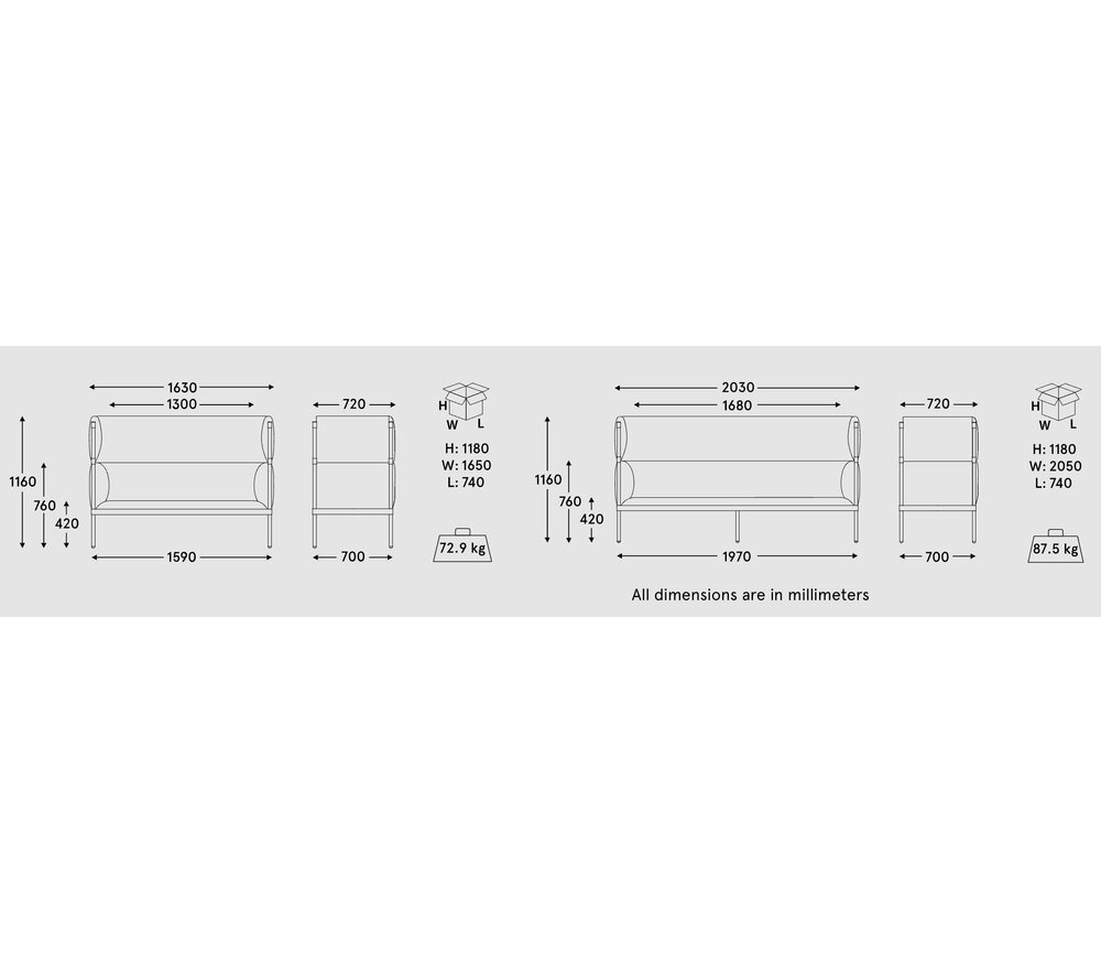 - Dimensions 2 places: 163l x 72p x 116h cm - 3 places: 203l x 72p x 116h cm