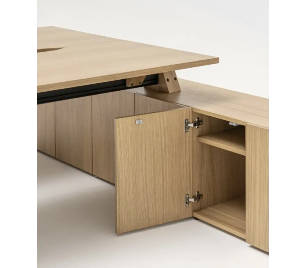 Le bureau de direction Viga est disponible en différentes tailles, avec une armoire de direction basse sur le côté qui permet de ranger les documents et les éléments fixes. Toujours basé sur son emblématique poutre en aluminium extrudé, il se présente à la fois léger et robuste.