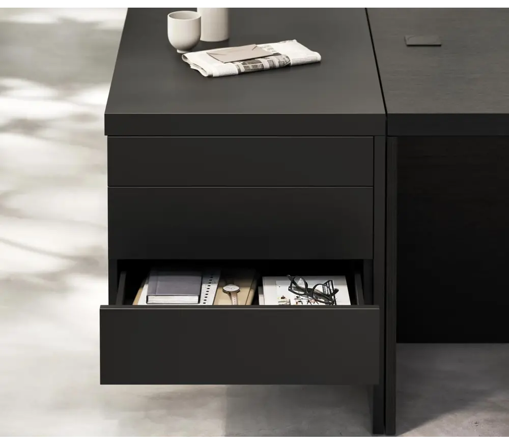 Pour répondre aux divers besoins de rangement et d’organisation, le bureau Mux70 peut être complété par un caisson à trois tiroirs intégré sous la console. Ces éléments offrent non seulement un espace pour classer les documents, mais peuvent également servir de rangement pour du matériel de sport – une solution idéale pour les jeunes cadres soucieux de concilier travail et mode de vie actif.