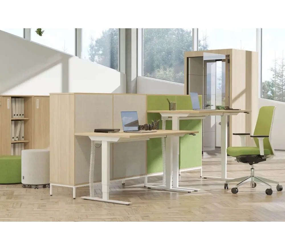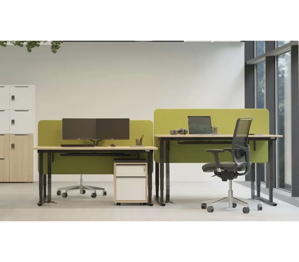 Les doubles bureaux(bureau en îlots) sont une excellente solution pour combiner des postes de travail. Le pied partagé des bureaux assis-debout assure une stabilité maximale des bureaux connectés.