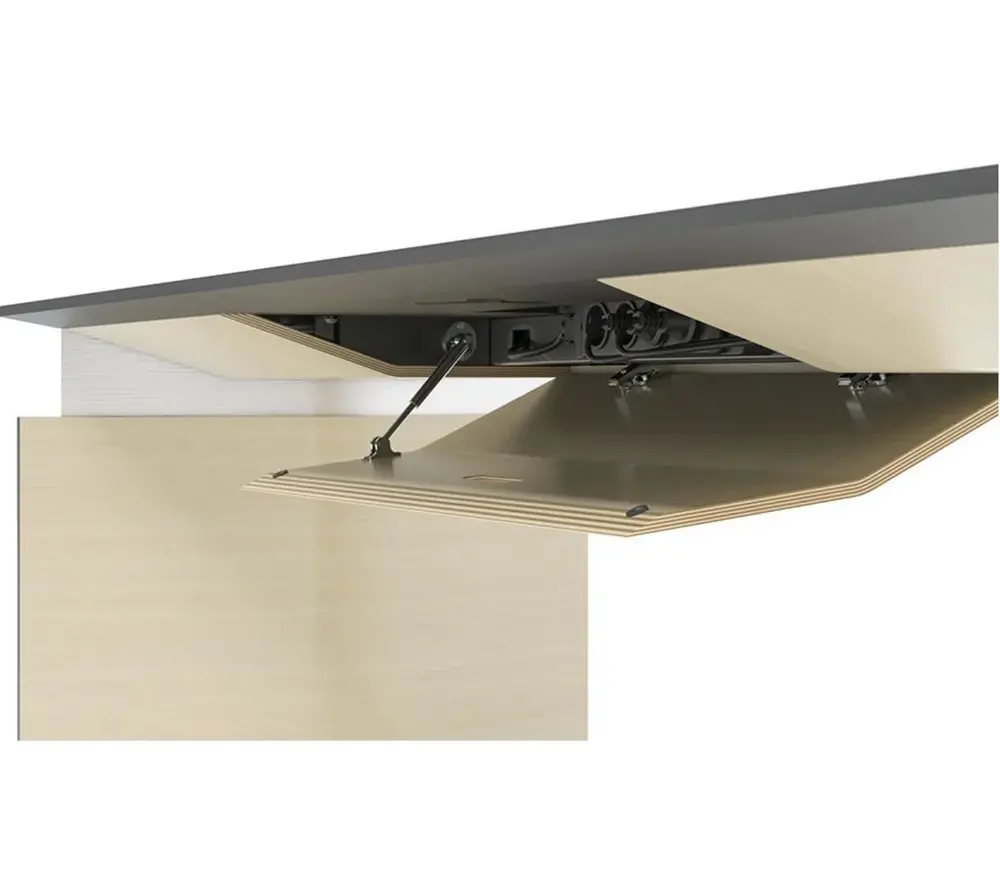 Le bureau design réglable Move dispose d'une alimentation 110-230V AC intégrée. Les fils cachés sont accessibles en ouvrant un élégant couvercle minimaliste. Les fils et les câbles sont alimentés à travers un trou triangulaire subtil avec un couvercle d'origine dans une couleur assortie à celle du bureau ou du bois naturel.