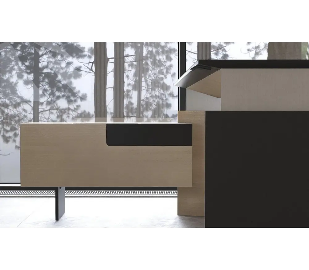 Une caractéristique frappante du mobilier de direction MOVE est son design mature et minimaliste. Des lignes épurées et élégantes, des transitions douces et des combinaisons de matériaux subtiles sont garantis pour créer un fort impact visuel dans n'importe quel bureau. La finition HPL Fenix, le placage de chêne naturel, de frêne ou de noyer et les surfaces en acier inoxydable poli se marient harmonieusement et créent une sensation de luxe subtil.