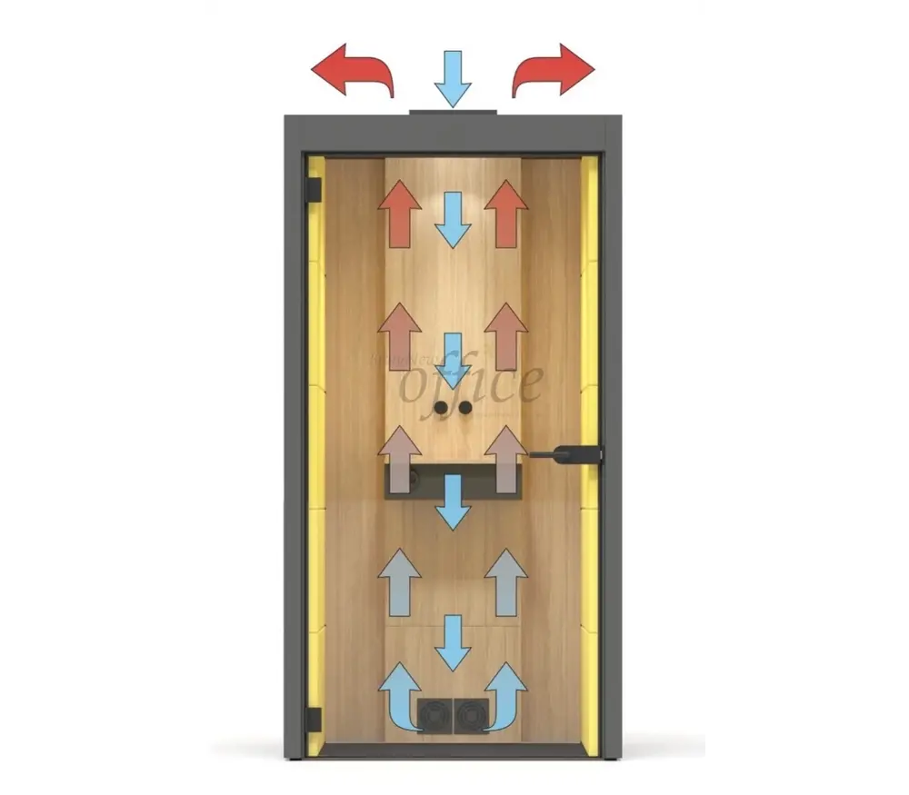 Dès qu'un employé quitte le Sonus, une ventilation intensive est automatiquement activée pour préparer la pièce au prochain utilisateur. Ce mobilier acoustique permet également d'économiser de l'énergie, car il diminue automatiquement l'intensité des lumières lorsque personne n'est dans la pièce et les éteint même après un certain temps