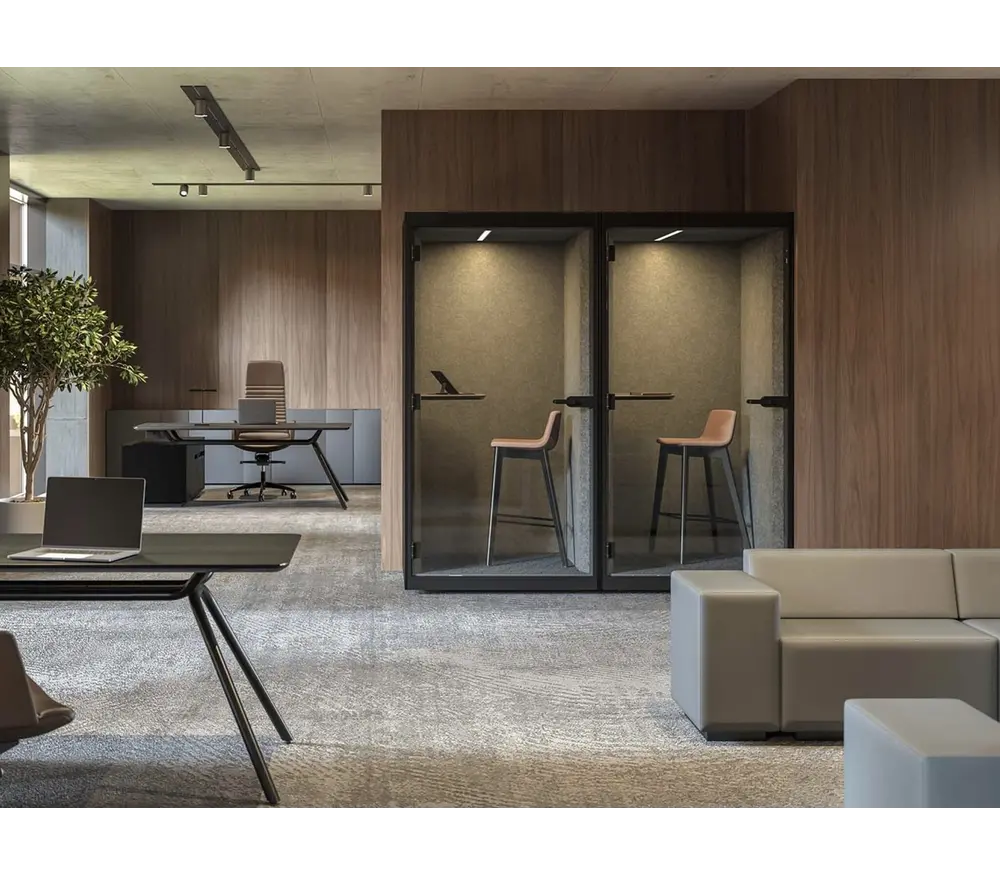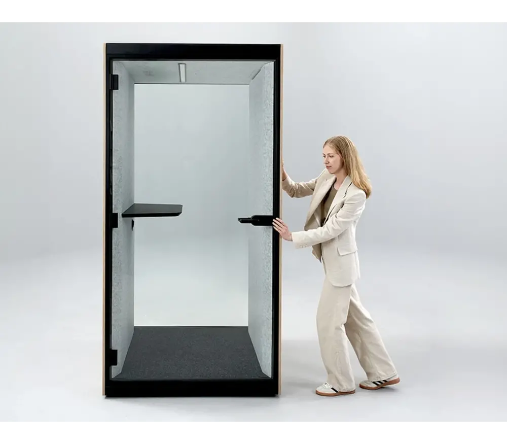 Les modules acoustiques Sonus offrent une excellente isolation phonique, créant un environnement agréablement calme. Selon la norme ISO 23351-1:2020, le module acoustique est classé dans la classe d'isolation acoustique B. Avec la porte Sonus fermée, vous êtes protégé des bruits gênants du bureau et vos conversations privées restent confidentielles.