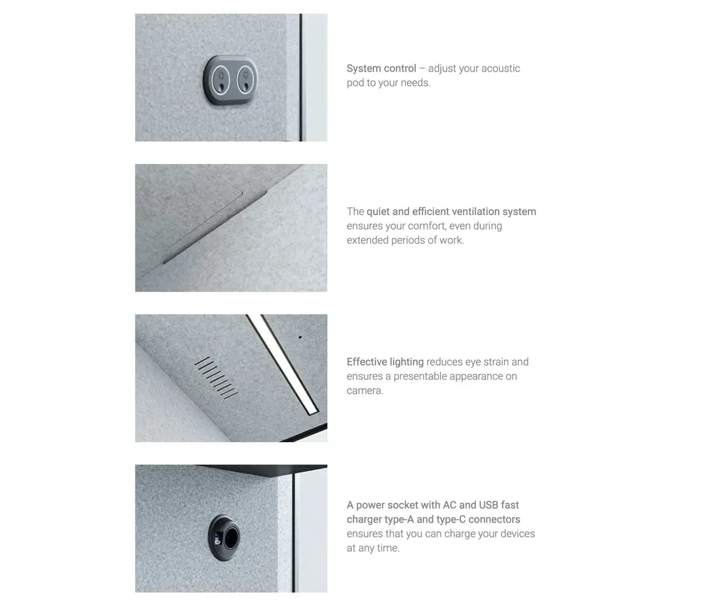 Les lignes lumineuses créent une capsule acoustique ouverte et accueillante, accentuée par la courbe caractéristique des parois latérales intérieures. Le produit a un design minimaliste mais contient toutes les fonctions essentielles. Chaque détail a été soigneusement étudié pour garantir à la fois une facilité d'utilisation et une esthétique élégante.