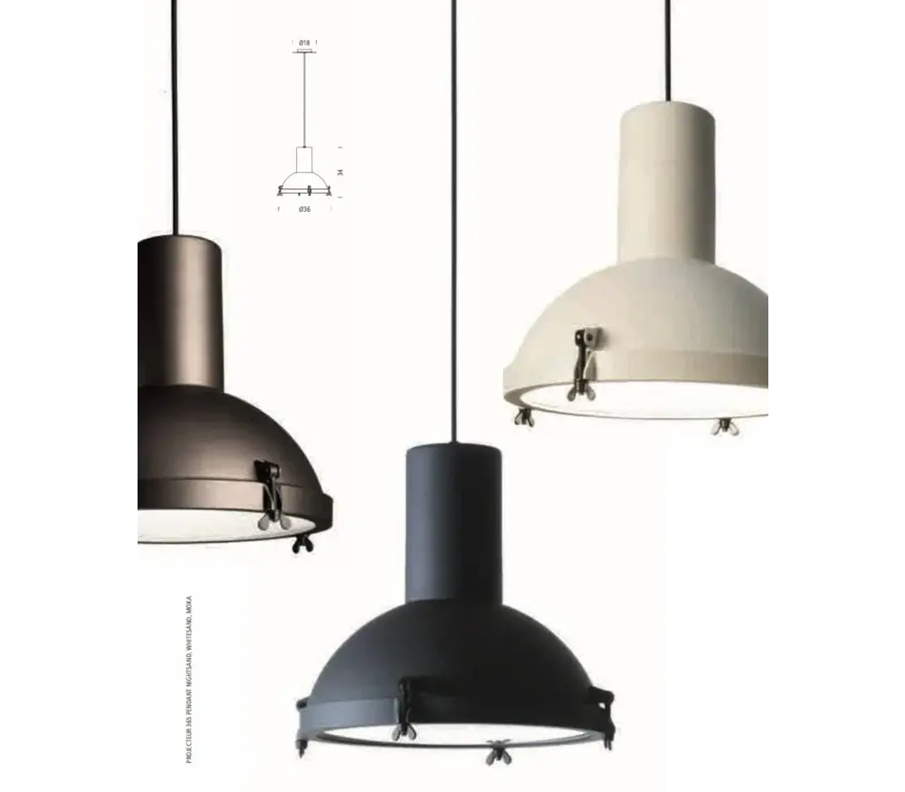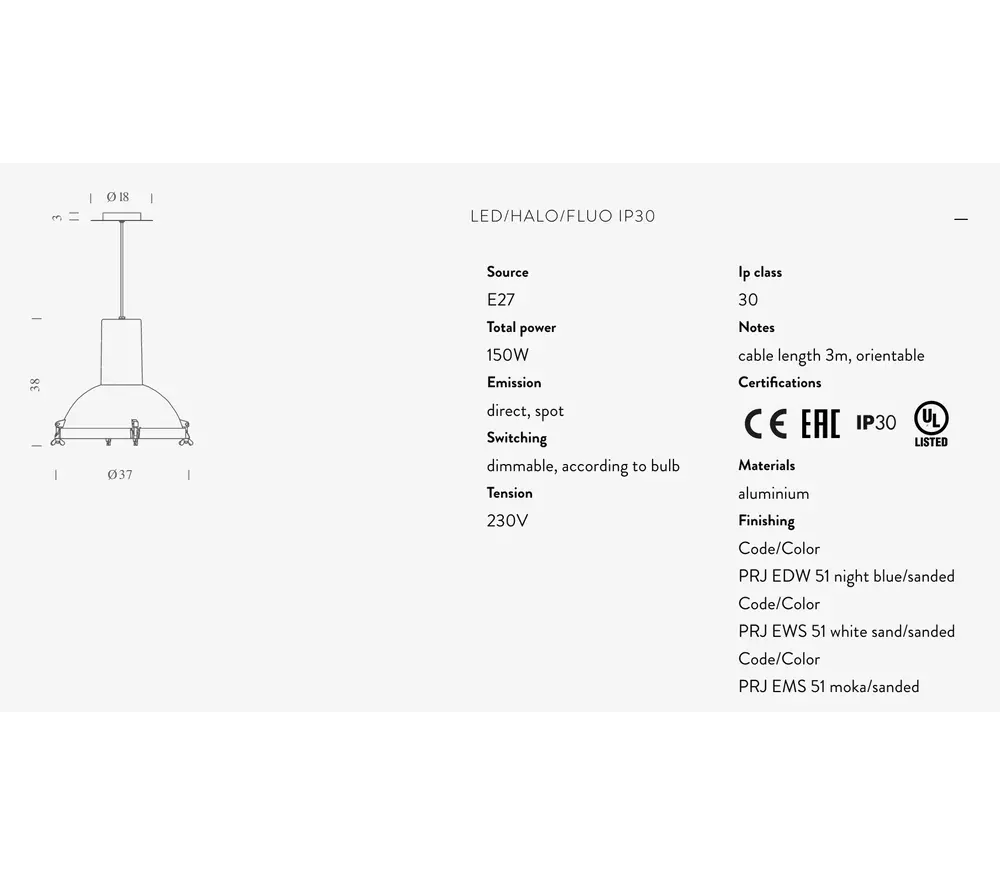 Cette lampe est un symbole du modernisme des années 1950. Inspirée de l'éclairage industriel de l'époque, elle est constituée d'un diffuseur en forme de projecteur, fixé à un socle circulaire. Entièrement réalisée en aluminium, Projecteur 365 suspension possède une finition peinture anthracite-bleu. Un trou dans la pince permet d'accrocher la lampe au mur, à la manière d'une applique.