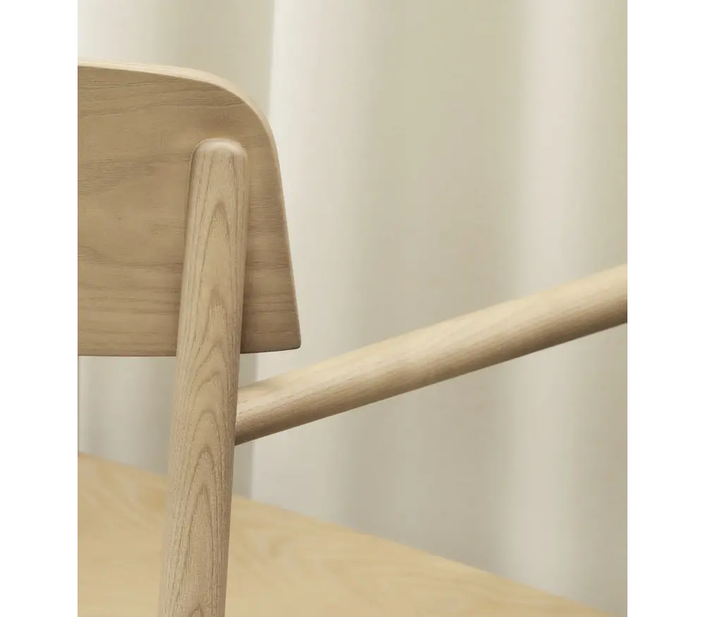 La chaise Timb a une structure en bois simple avec une richesse de détails dans le contraste entre les courbes et les lignes nettes. Les traditions artisanales sont également visibles dans les joints élégants, qui permettent de fabriquer la chaise sans avoir besoin de vis, permettant au bois lui-même de servir de point focal. La chaise se compose d'un cadre en bois de frêne massif et d'une assise et d'un dossier larges et confortables en placage de frêne.