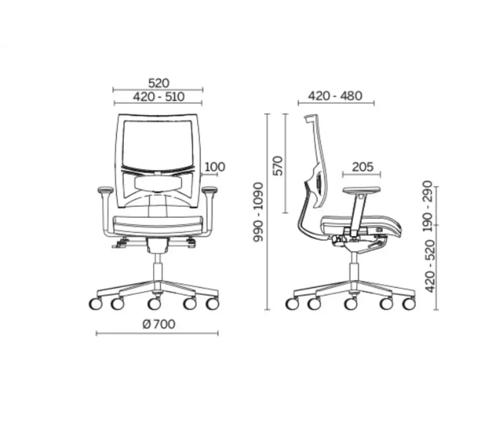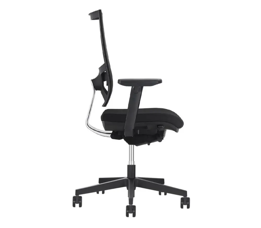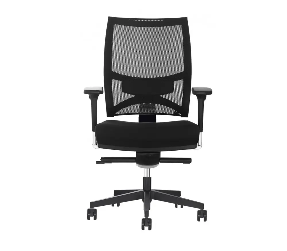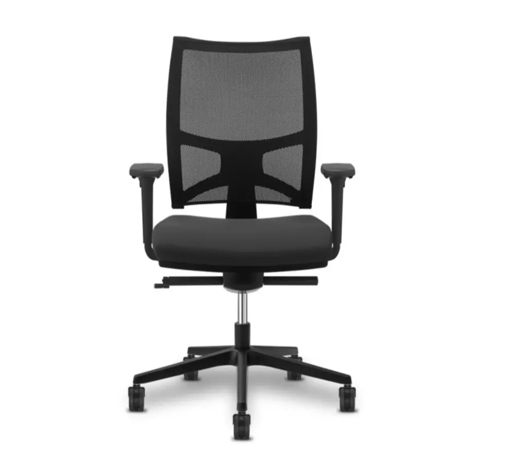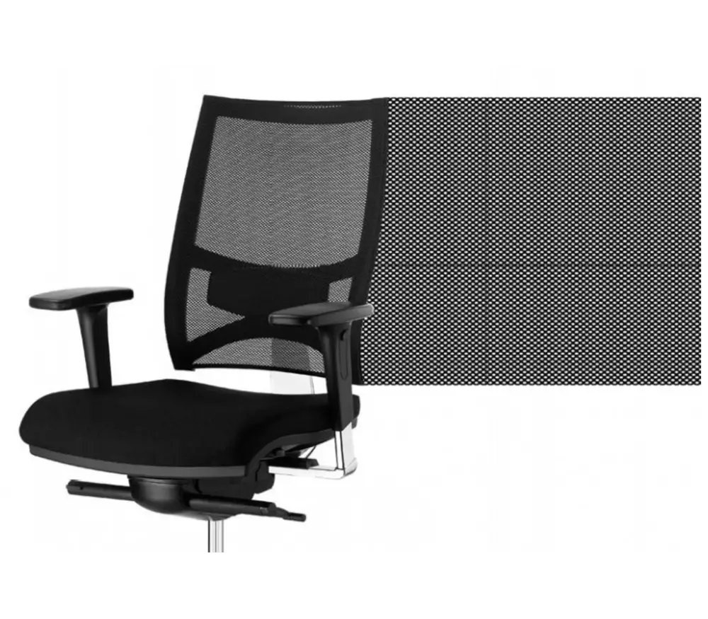 - Caractéristiques techniques : maille dossier, support de dossier flexible pour plus de confort (peint en noir), support lombaire réglable, assise en mousse polyuréthane injectée à froid sans CFC, siège en tissu rembourré, avec accoudoirs, mécanique synchrone verrouillable en 5 positions (avec manivelle détachable sur le côté pour le réglage de la tension d'inclinaison), base en nylon renforcé noir, certification EN 1335