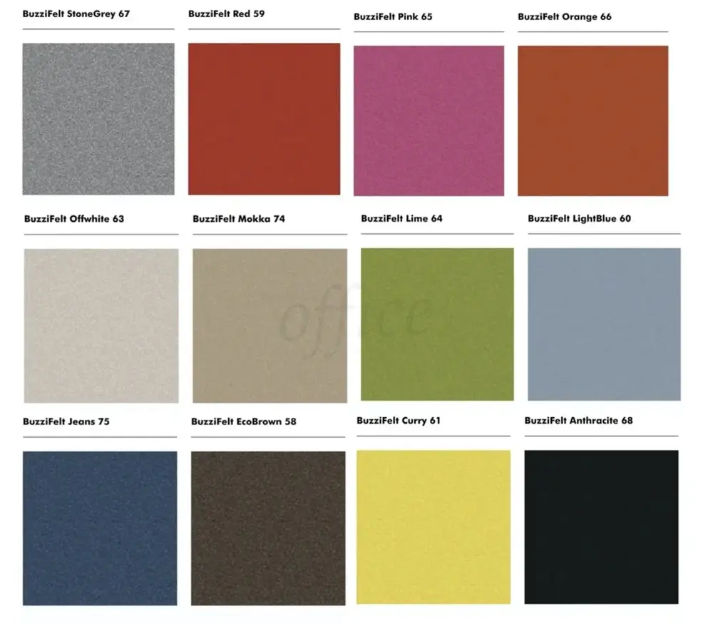 Au bureau, dans le foyer ou à l'accueil, la mode est aux espaces de travail ouverts afin de favoriser la communication - mais cela se traduit également par un bruit nettement accru. Or, un niveau sonore trop élevé est un facteur de stress nuisible à la santé. Les produits de la série BuzziSpace remédients et méliorent le climat de travail en étouffant les petits bruits de la vie de bureau. Les surfaces lisses et vitrées réfléchissent le bruit et l'amplifient. C'est donc à ce niveau qu'interviennent les éléments insonorisants de BuzziSpace. Les objets capitonnés BuzziSpace décoratifs conçus pour absorber les bruits sont entièrement fabriqués en matériaux recyclés: tissu en feutre. Pour un silence et une intimité accrus, les produits BuzziSpace sont idéale pour isoler un poste de travail ou un coin réunion. Ils améliorent aussi l'isolation phonique. Le feutre BuzziFelt, qui est écologique et absorbe le bruit, en fait des meubles idéal dans les espaces de vie, les salles d’attente ou les restaurants, mais aussi lors d’événements de grande envergure. Buzzispace a des paravents insonorisés, des éléments décoratifs, des écrans acoustiques, lampes, plafonniers, cloisons pour murs ou plafond qui isolent et beaucoup plus.
