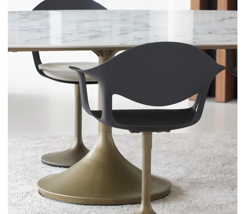 Adaptés à une utilisation intérieure et extérieure, ils sont légers et solides, et disponibles dans des finitions polyvalentes avec une gamme de plateaux de table. Un détail frappant est que les pieds sont inclinés vers l'extérieur à partir d'un point central, donnant à l'ensemble un aspect encore plus léger.