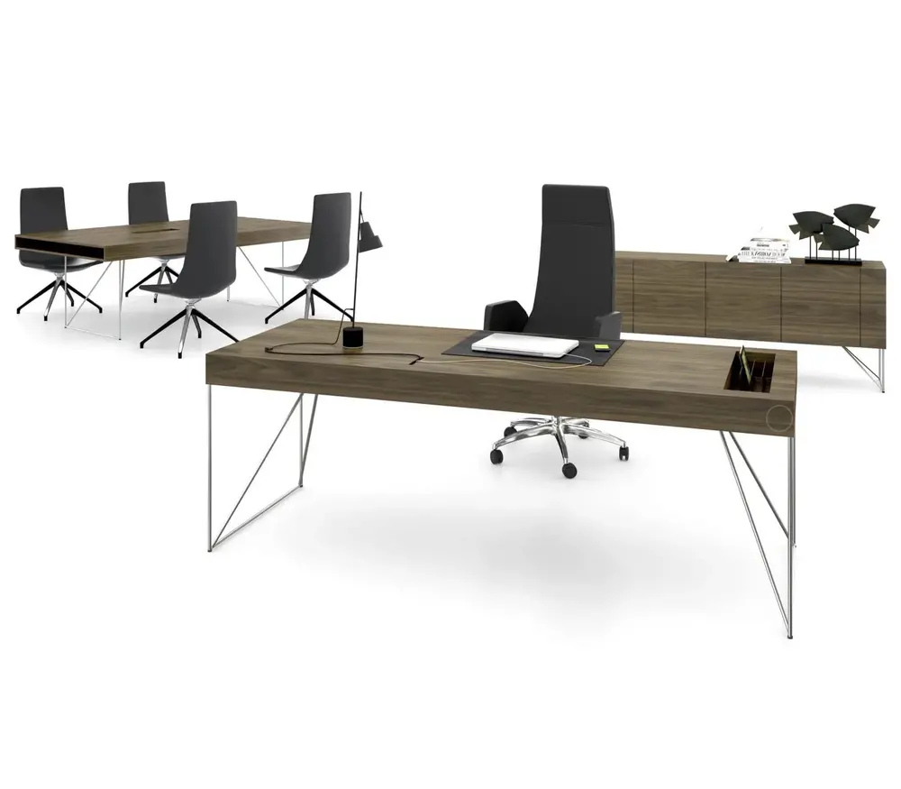 Les tables de conférence exécutives Narbutas Air sont proposées avec différentes options. Les tables de conférence peuvent être placées dans le bureau du directeur ainsi que dans les salles de conférence. Les réunions peuvent être organisées à différents niveaux, donc les pièces, le mobilier et les matériaux diffèrent.