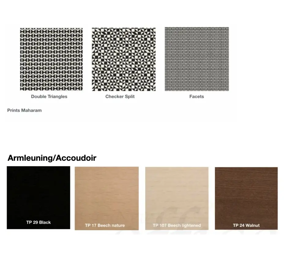 - Matériaux: Tube d'acier chromé, corps et plateau teintés(laqué), tissu Maharam