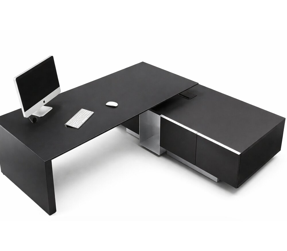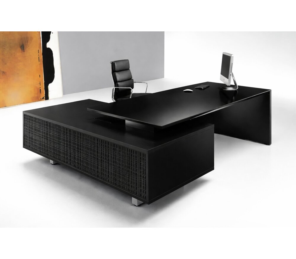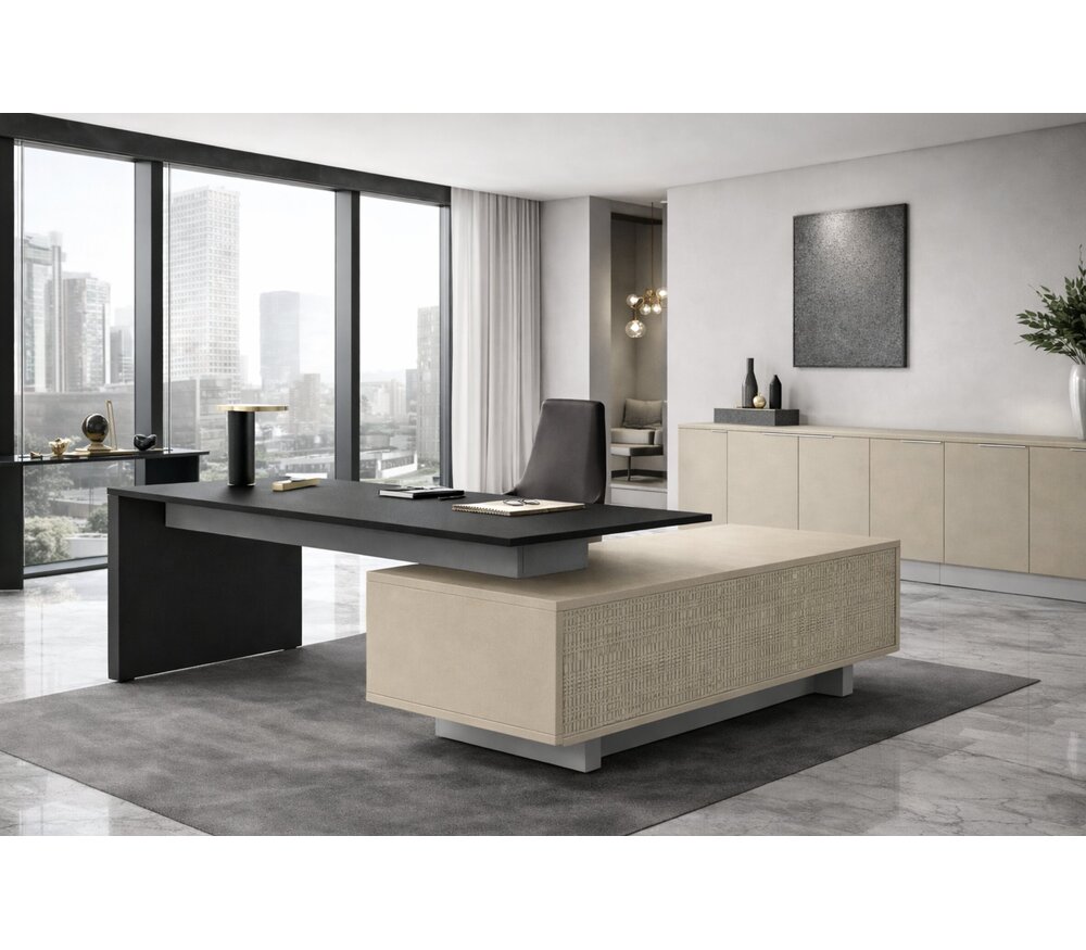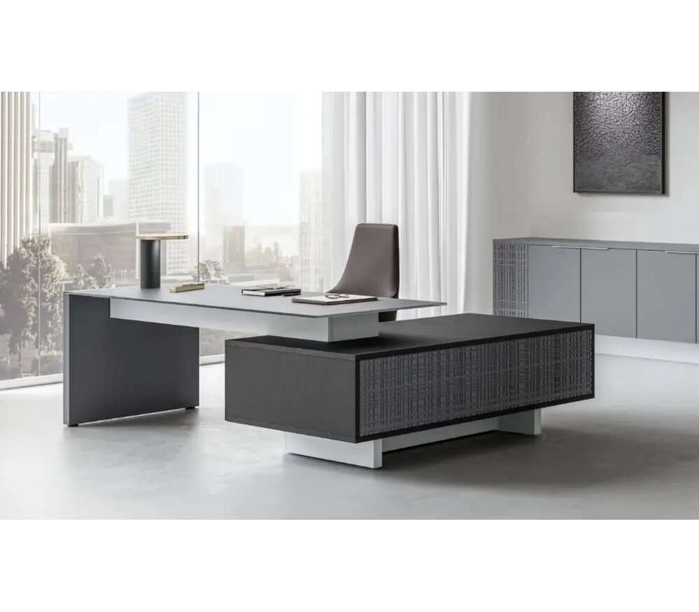 La combinaison de bureau Modi se distingue par ses dimensions généreuses et sa finition haut de gamme. Avec une largeur allant jusqu’à 220 cm et une profondeur de 180 cm, ce bureau offre un espace de travail impressionnant, parfaitement adapté aux besoins d’un bureau de direction ou d’un environnement exécutif.