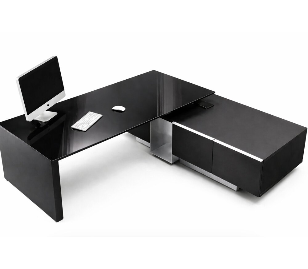 Le bureau Ultom Modi avec plateau en verre et crédence est une solution haut de gamme pour les environnements de direction modernes.