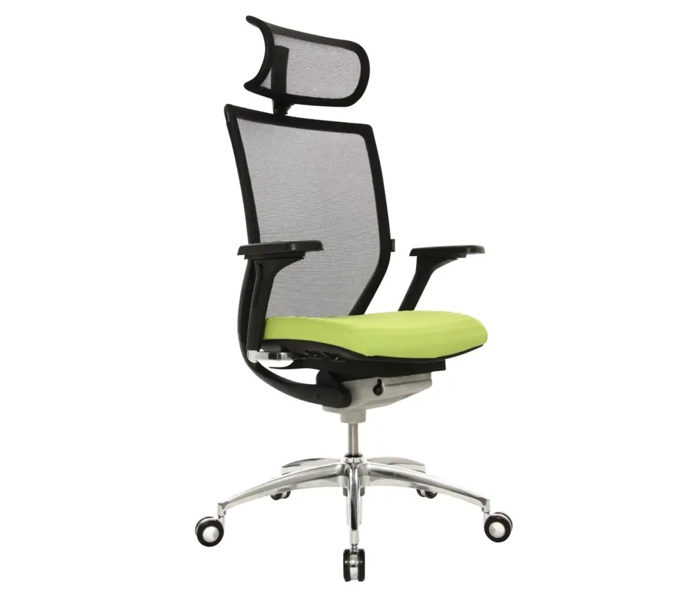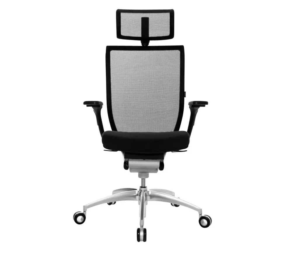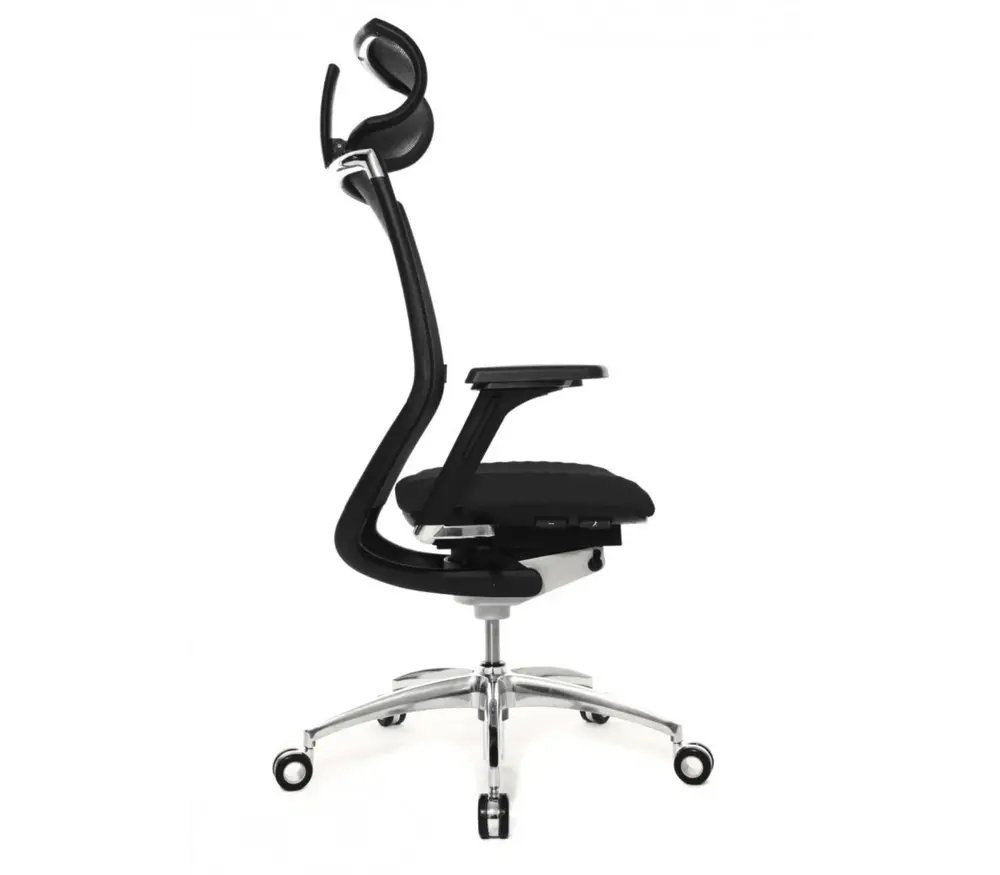 Le piètement en aluminium poli à la main incarne la qualité artisanale au service du design. Les accoudoirs élégants, réglables en hauteur et en largeur via un système clip-lock précis, sont équipés de coussins souples ajustables en largeur et en profondeur pour un soutien ergonomique optimal.