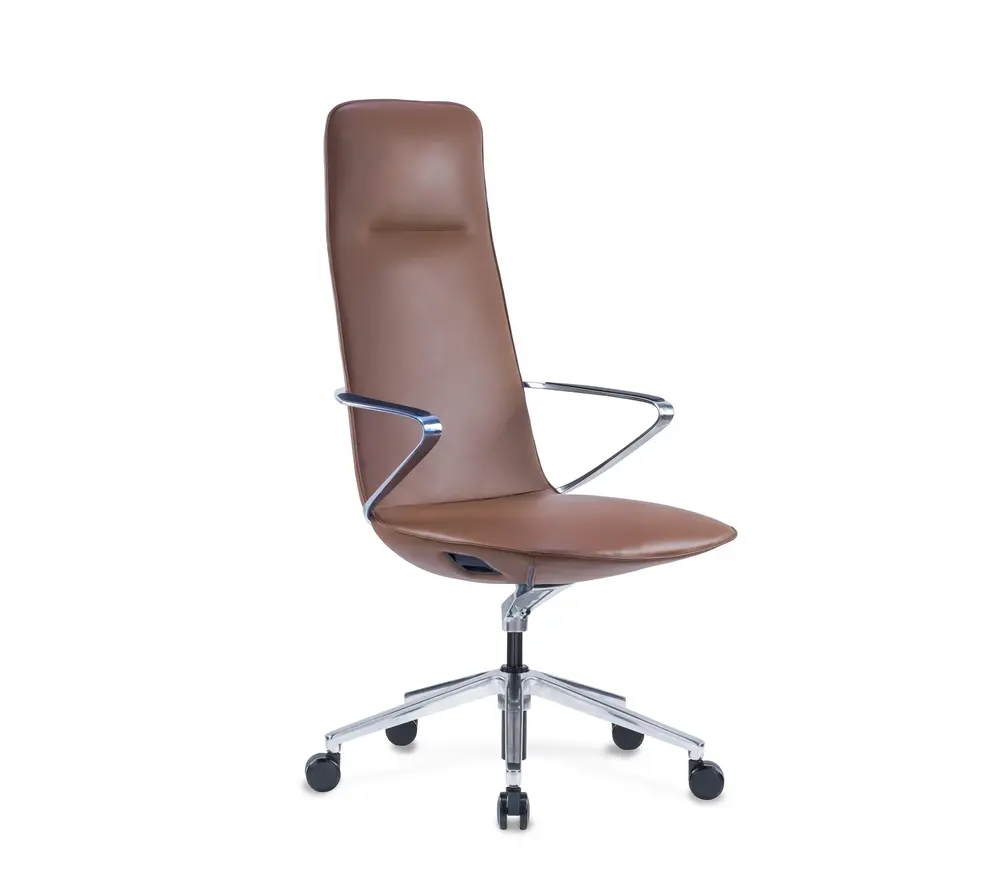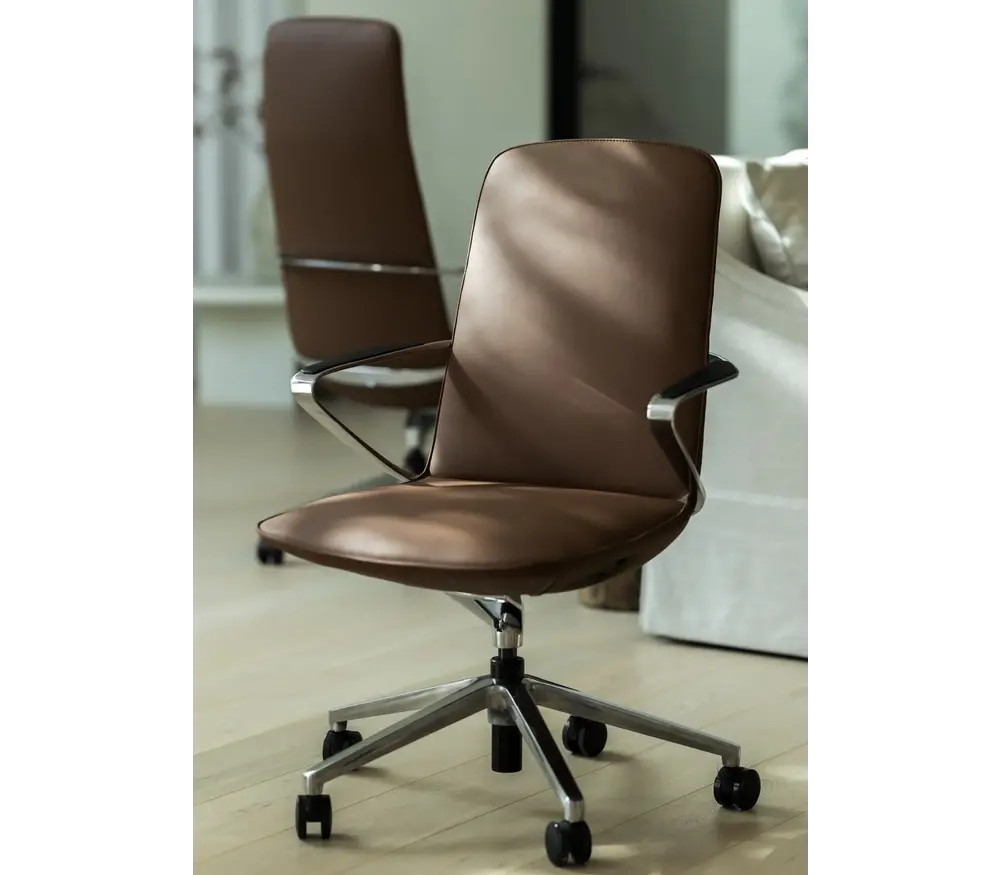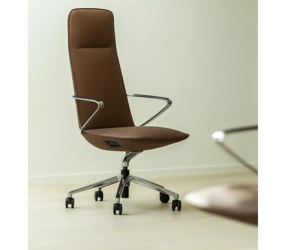 De Amola bureaustoel is uitgevoerd in hoogwaardig cognac leder en afgewerkt met een aluminium chroom onderstel en vaste aluminium armleuningen. Deze combinatie van warme lederkleur en strakke metalen accenten zorgt voor een elegante en professionele uitstraling die perfect past in directiekantoren en moderne werkruimtes.