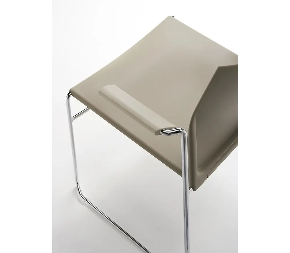 De Scoop stoel met armleuning van Brand New Office werd gemaakt van PVC en heeft een chromen onderstel.