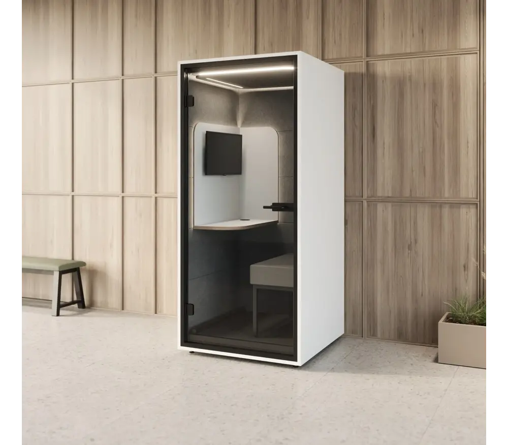 De Box1 Sit is een moderne akoestische belcel voor één persoon en dé oplossing voor rust en concentratie op de werkvloer. Dankzij het tijdloze en minimalistische design past deze geluidsdichte telefooncel perfect in elk kantoorinterieur. Ideaal voor ongestoord bellen, videogesprekken en gefocust werken.