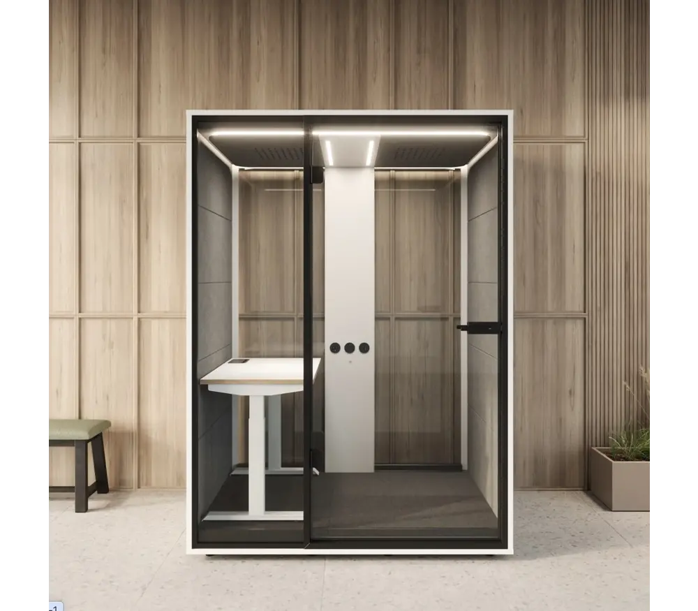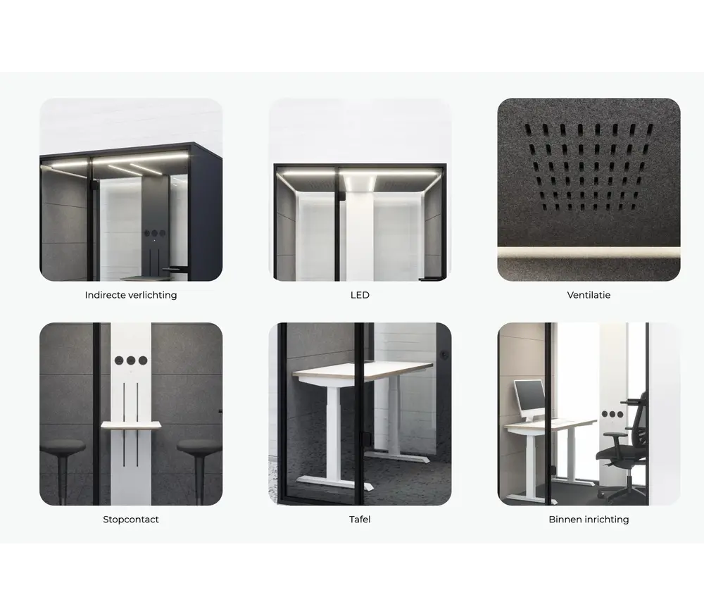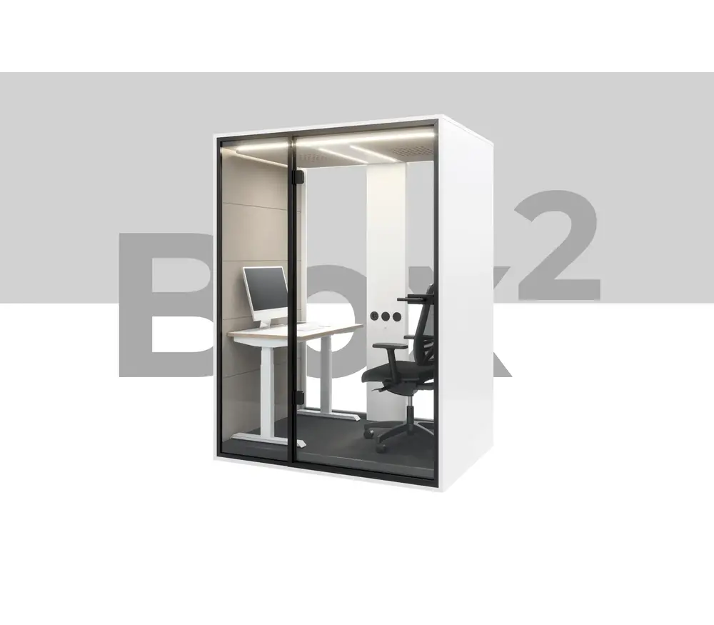 De Box2work Geluidsdichte cabine is ontworpen voor één persoon en combineert slimme technologie met optimaal comfort: