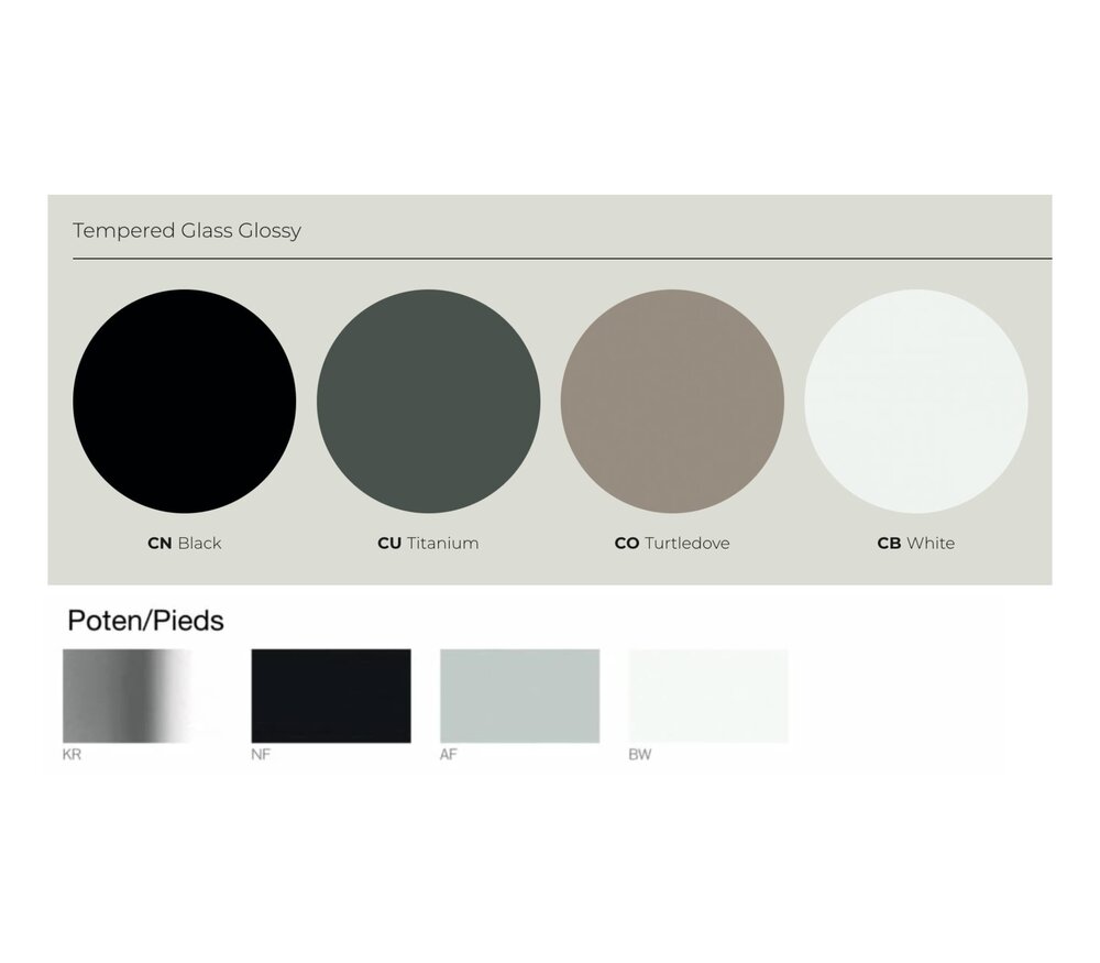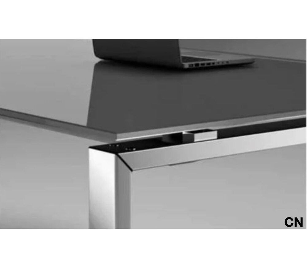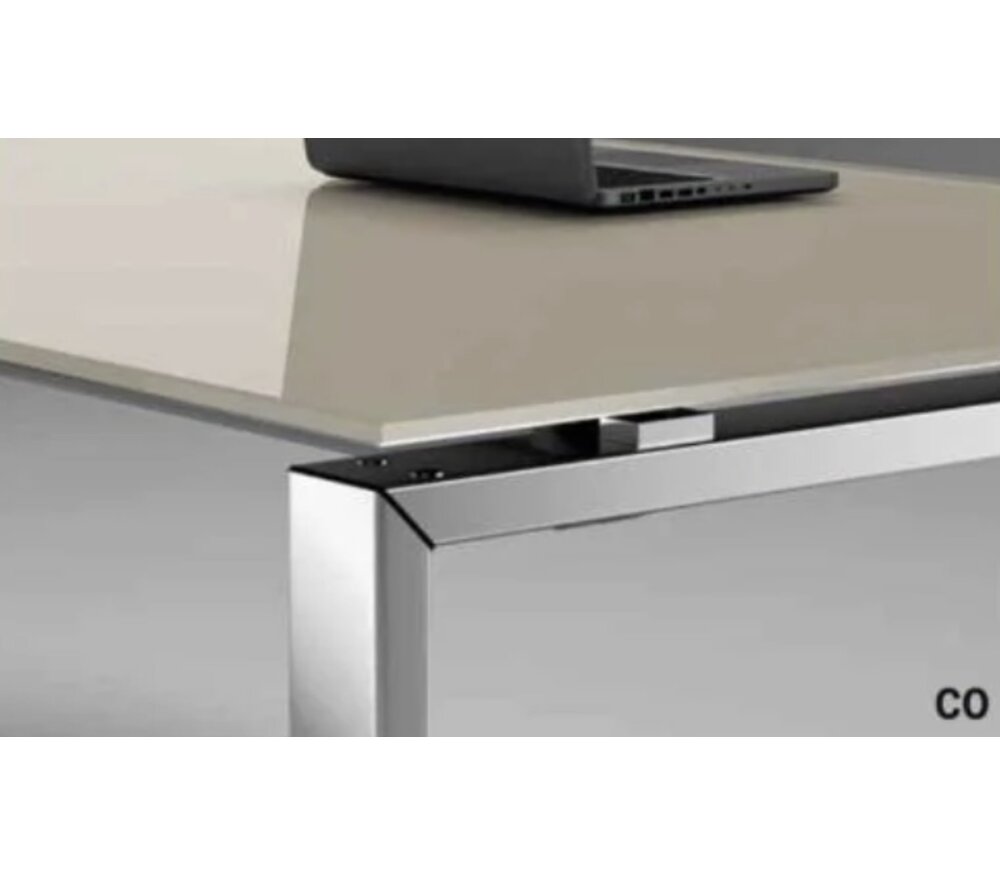 De werkbladen zijn gemaakt in getemperd glas met een dikte van 12 mm, gepolijst met afgeschuinde randen en het onderliggend oppervlak is gezandstraald of geverfd in verschillende kleuren. De glazen bladen steunen op de structuur met zuignappen. De poten werden gemaakt uit vier getrokken stalen buizen(geborsteld) die aan elkaar gelast werden. Om dit design bureau verder uit te bereiden kan u opteren voor een aanbouwtafel van 100 x 60 en 120 x 60cm (of op aanvraag een lage dressoir van 169cm of 210cm lang).