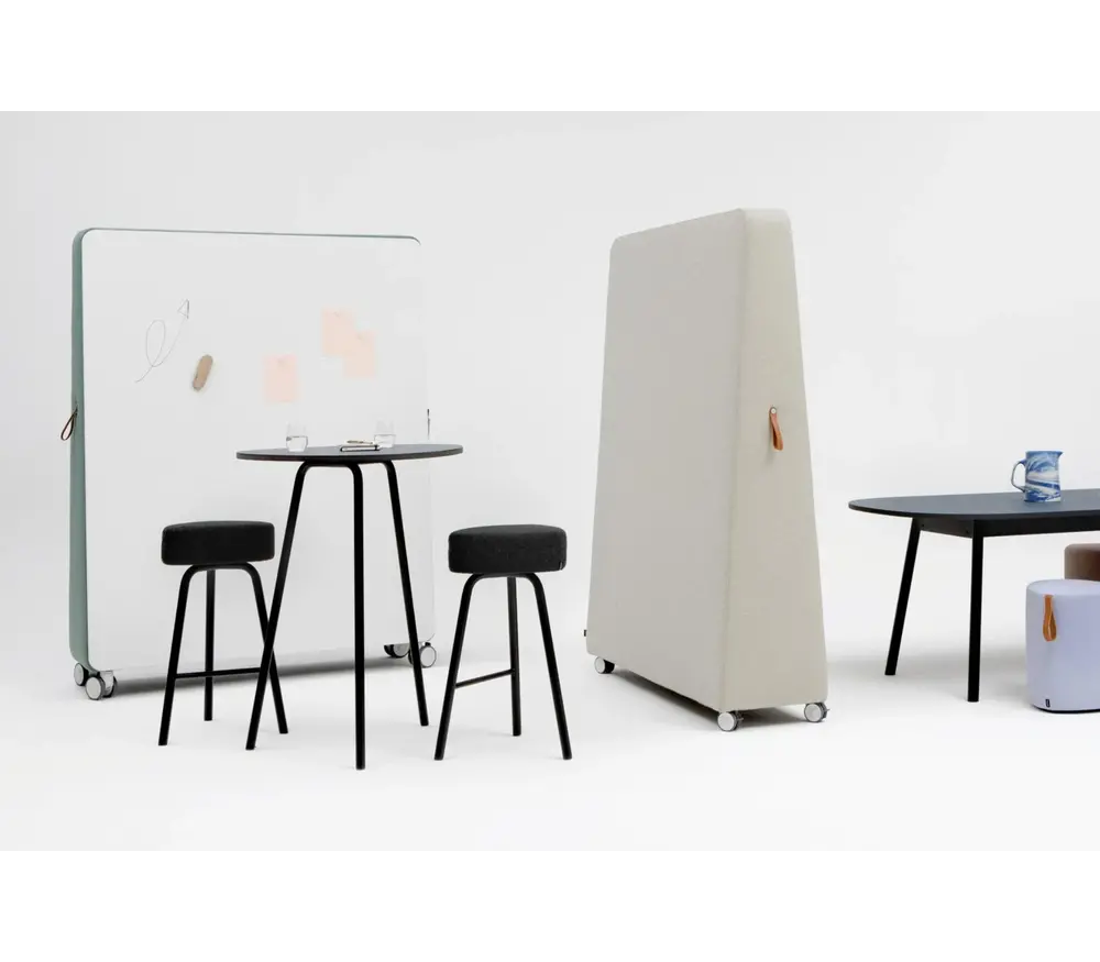 Cascando Trunk mobiele scheidingswand /whiteboard is een mobiel whiteboard met een gestoffeerd memobord aan de achterkant.