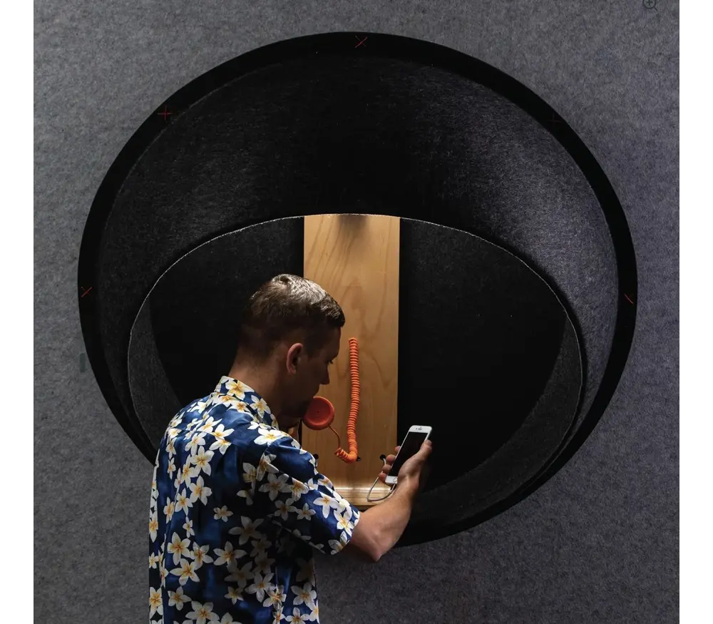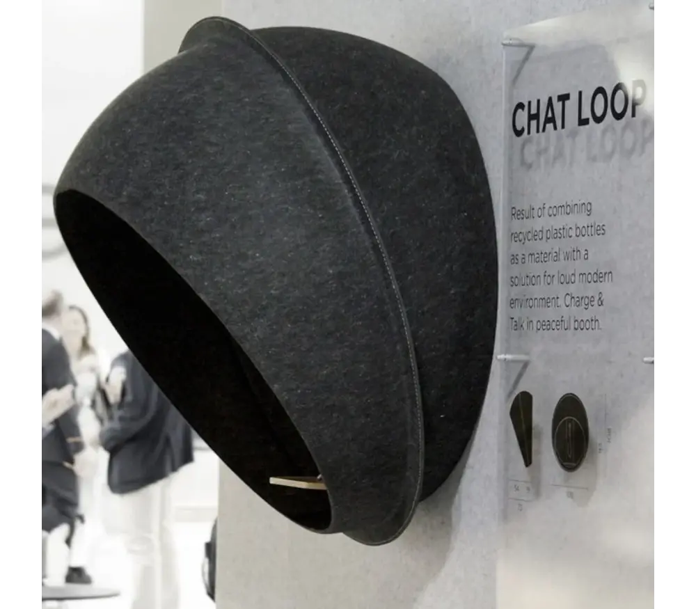 De Donar Chat Loop gerecycleerde telefooncel vindt de traditionele telefooncel opnieuw uit in een modern materiaal dat werkt als een geweldige geluidsisolator.