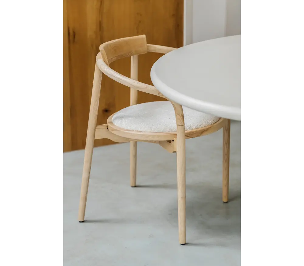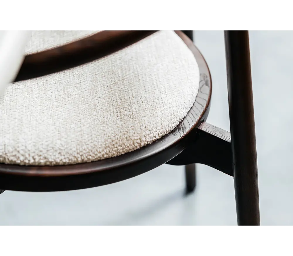 Met zijn minimalistisch design, essencehoutstructuur en zachte bouclé bekleding combineert deze stoel vakmanschap, esthetiek en functionaliteit.