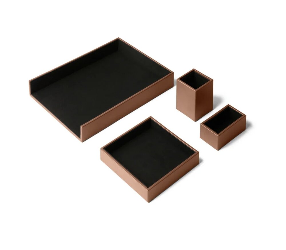 De set bestaat uit een valet tray, penhouder, papiertray en visitekaarthouder en combineert strak design met verfijnde ambachtelijke afwerking.
