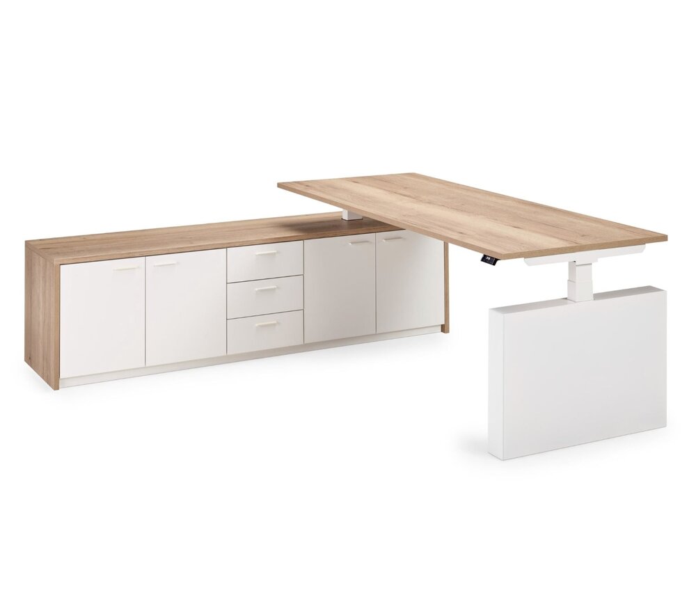 Met de Flex directiebureau stelt u eenvoudig uw ideale werkplek samen. Kies uit verschillende bureaubladen, robuuste onderstellen en een volledig uitgeruste aanbouwkast. Dankzij de ruime keuze in maten en afwerkingen kunt u het bureau volledig afstemmen op uw werkstijl en beschikbare ruimte.