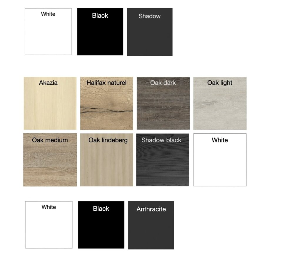 - Optioneel: Akoestische achterwand, Melamine topblad i.p.v. stalen topblad, Volledige melamine ombouw i.p.v. stalen topblad, Uittrekframe voor hangmappen, Plantenbakken voor extra groen en sfeer