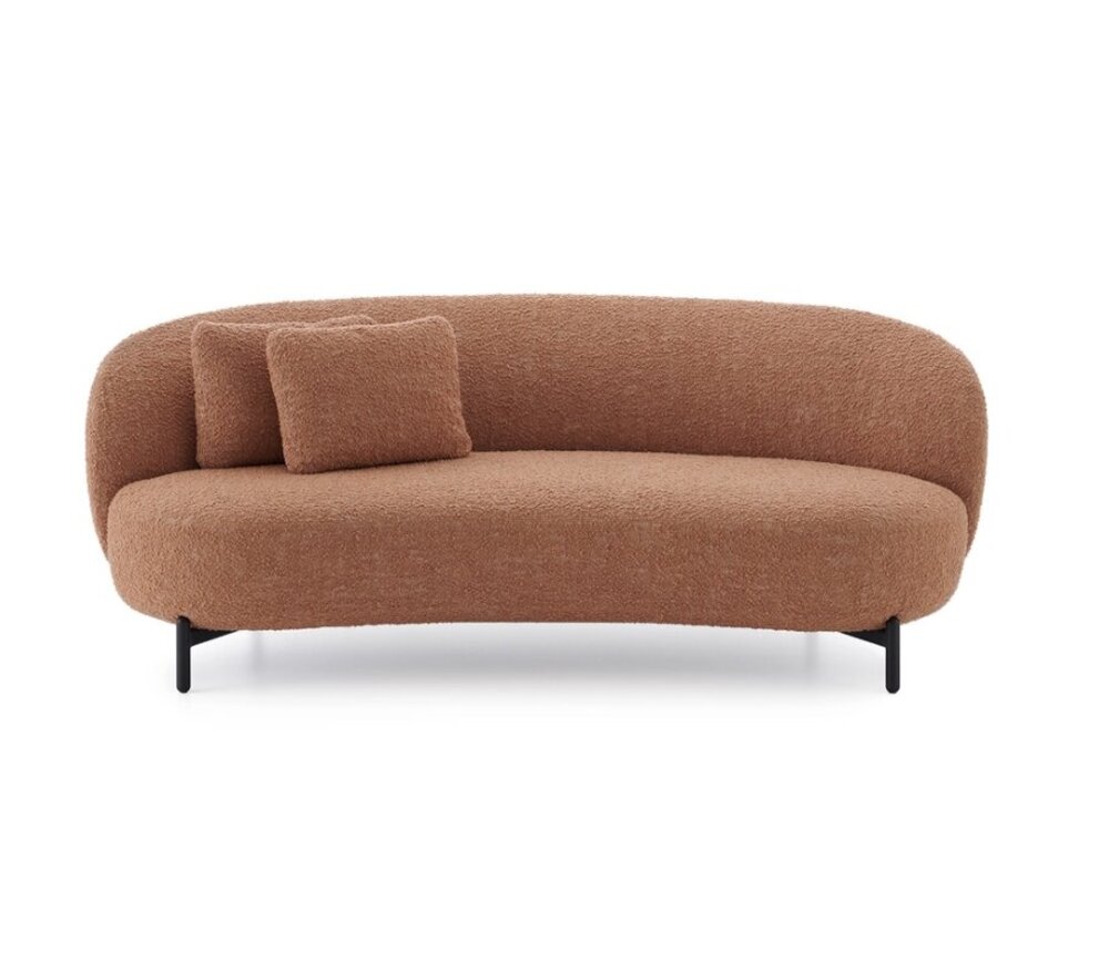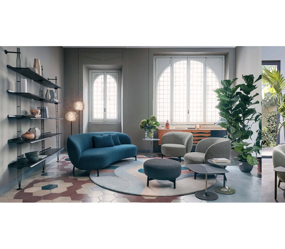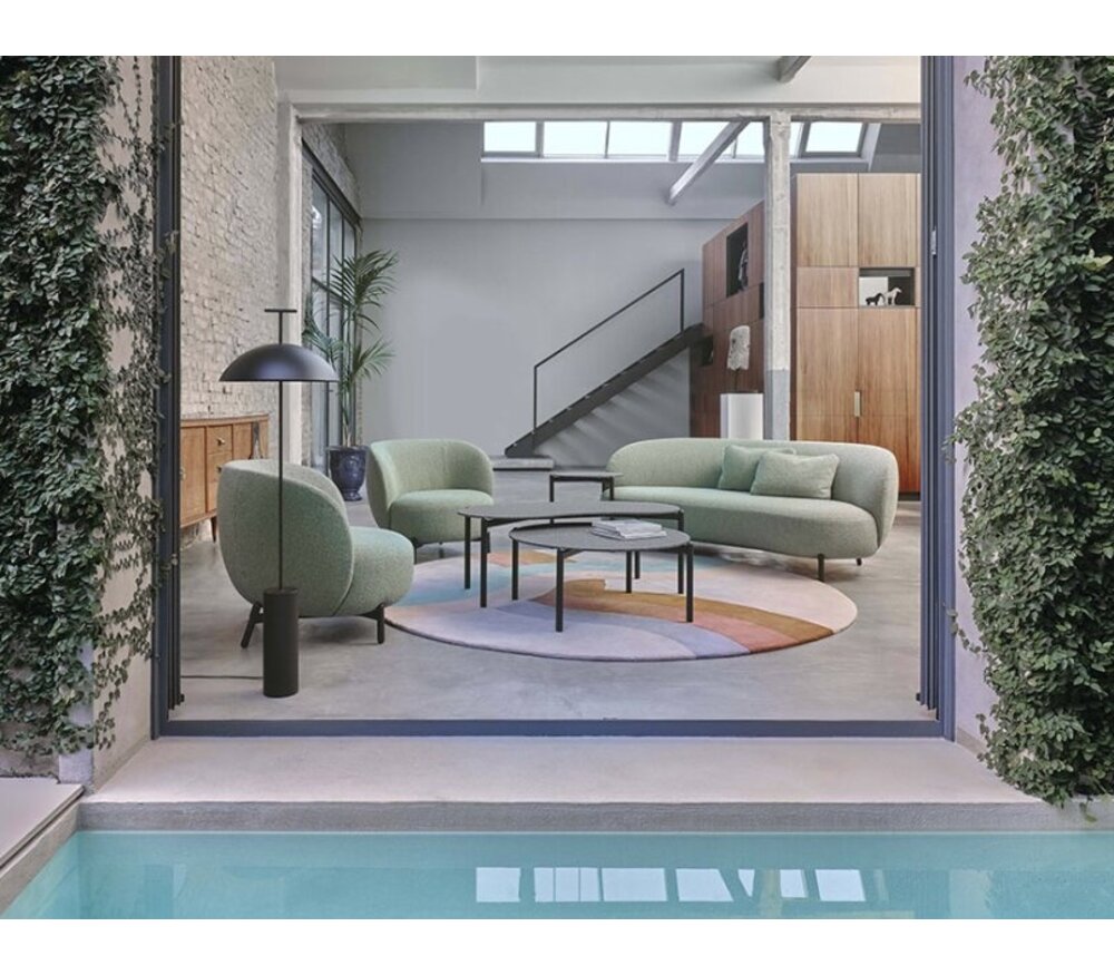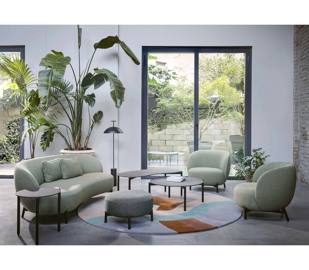 Een essentieel, geverfd metalen frame ondersteunt royale gestoffeerde delen. De bank, fauteuil en poef zijn verkrijgbaar in zachte boucléstof of gemengd (de contractoptie) in olijfgroen, petroleum, sienna en grijs naar keuze.