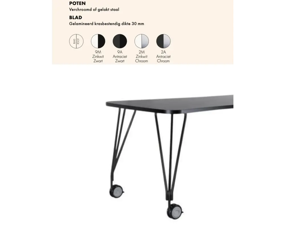 De wielen zijn ook uitgerust met auto-lock remmen zodat u de werktafel kan blokkeren en kan zorgen voor de nodige stabiliteit. Kartell Max's neutrale design en de twee decor-vriendelijke kleuren zwart en wit, maken het gemakkelijk te combineren met andere Kartell kantoormeubelen. De Kartell Max bureaus zijn beschikbaar in een 160cm of 190cm lange versie met een blad dat afgewerkt is in een krasbestendige melamine(30cm dikte) en verchroomde poten.