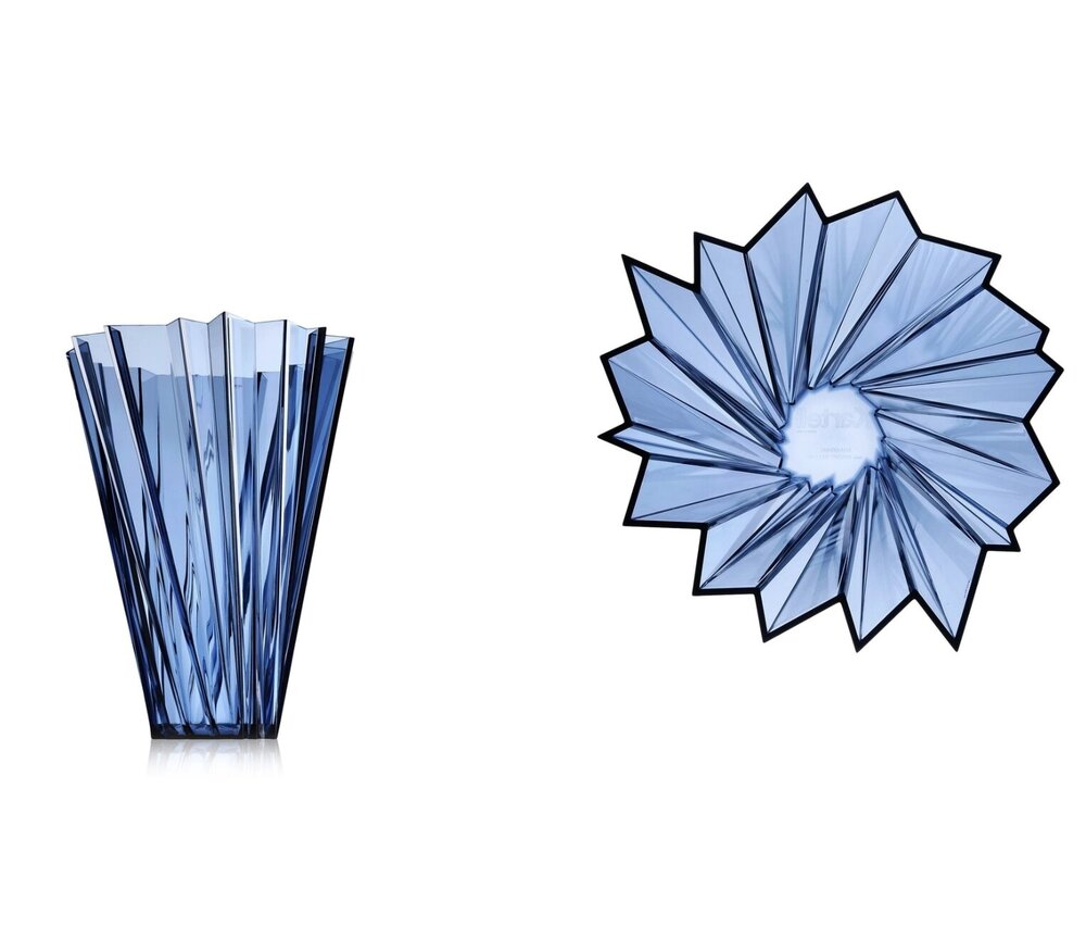 De gefacetteerde Kartell Shanghai vaas die van de bodem naar de top lijkt op een wervelwind straalt energie en licht uit.