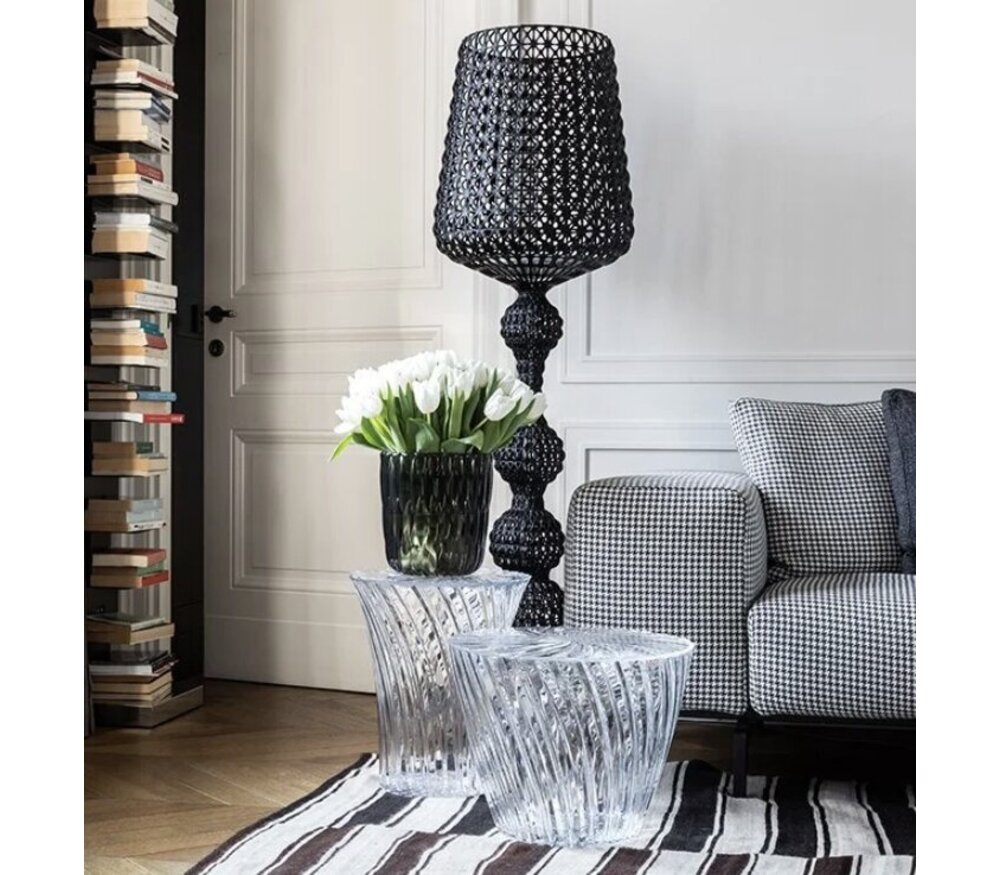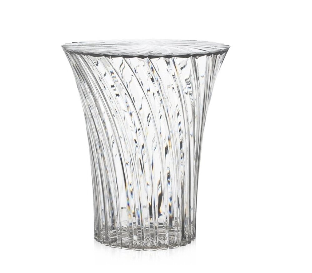 Deze doorzichtige Kartell Sparkle zitkruk en lage bijzettafel zijn een ontwerp van Tokujin Yoshioka voor Kartell.