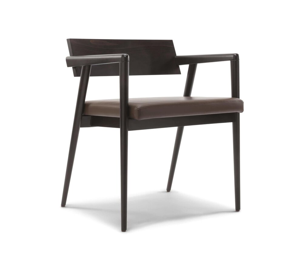 De Dormito is een compacte, elegante fauteuil met een frame in massief beukenhout en een met leder beklede zitting. Het houtwerk is verkrijgbaar in verschillende kleuren uit de collectie.