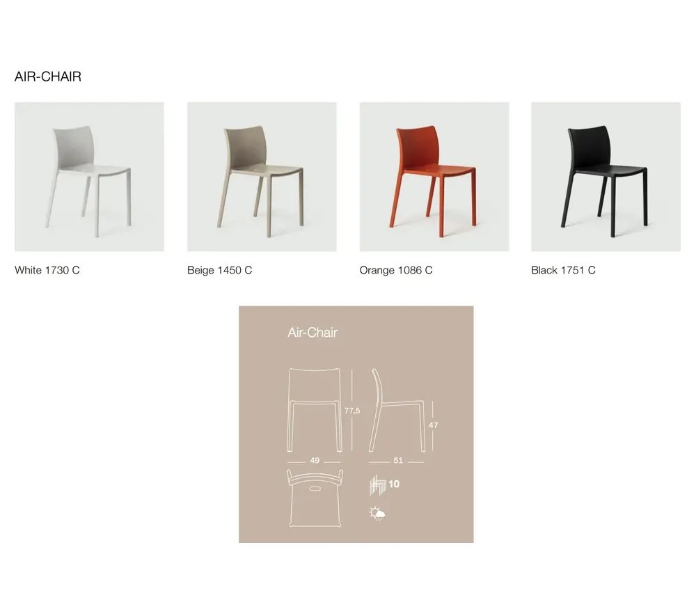 Deze Air stoel brengt leven op kantoor of in uw conferentiezaal. De naam verklap eigenlijk waarom ze hem de "Air-chair" noemen: hij is namelijk zo licht als een veertje waardoor hij gemakkelijk te transporteren is. Bovendien is deze designstoel stapelbaar tot 10 stuks! De Air chair van Magis is ook geschikt voor buitengebruik waardoor hij een perfecte dienst kan doen als terras of bistrostoel. De Air Chair van Jasper Morrison kan ook gebruikt worden als conferentiestoel, wachtkamerstoel, gewone keukenstoel of als Horeca stoel(hotels-restaurants-cafés). Deze eenvoudige stoel heeft alle eigenschappen van een moderne klassieker waardoor hij in elke omgeving pas. Je kan de Air-chair stoel verkrijgen in een breed kleurenpallet. De Air-familie bestaat uit een Air-chair en een Air-Armchair en dit allemaal tegen een zeer betaalbare prijs! Hij is enkel bestelbaar vanaf 4 stuks en snel leverbaar.
