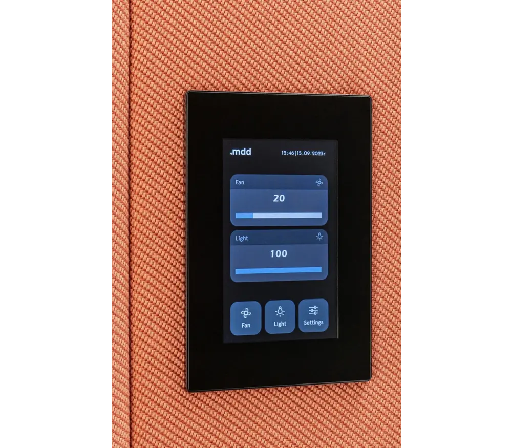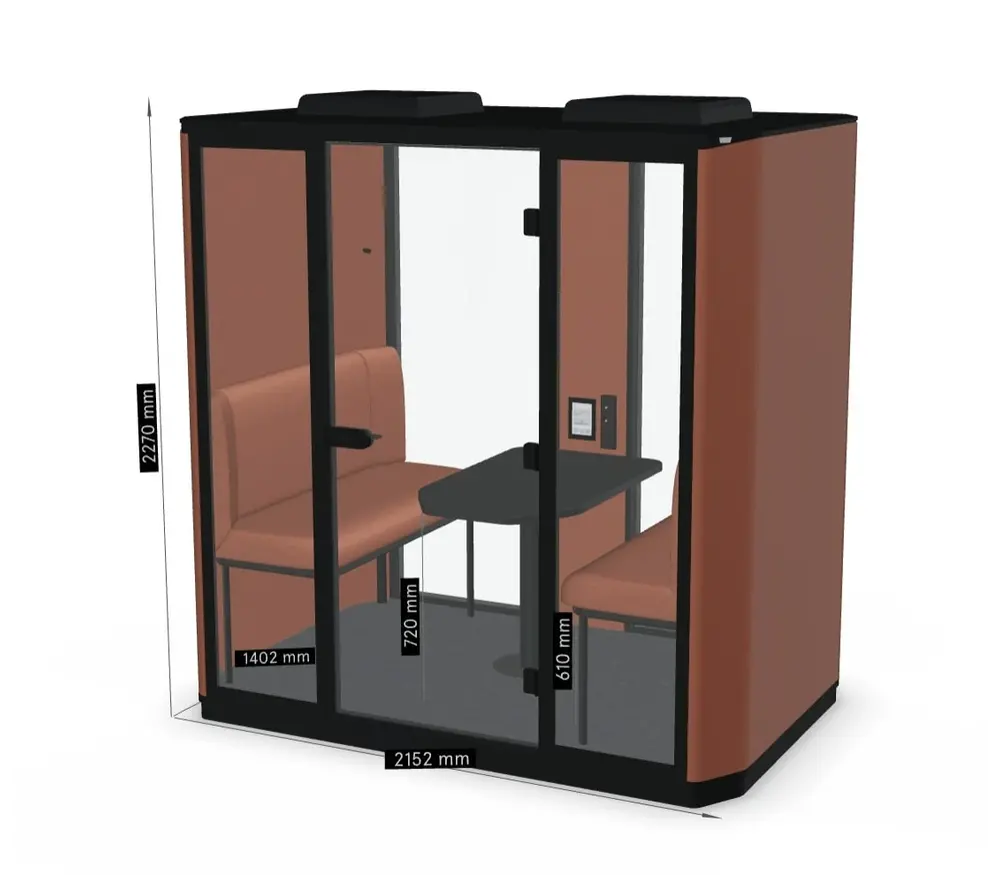 De moderne Mdd Coda verrijdbare akoestische cabine voor 4 personen is een combinatie van functionaliteit, esthetiek en technologie en biedt stilte en privacy voor telefoongesprekken, videoconferenties en individueel rustig werk. Externe verlichting geeft de beschikbaarheid van de stand aan; ze zijn rood als er iemand binnen is. Ze kunnen worden in- en uitgeschakeld via een bedieningspaneel dat ook is aangesloten op de systemen voor binnenventilatie en verlichting.
