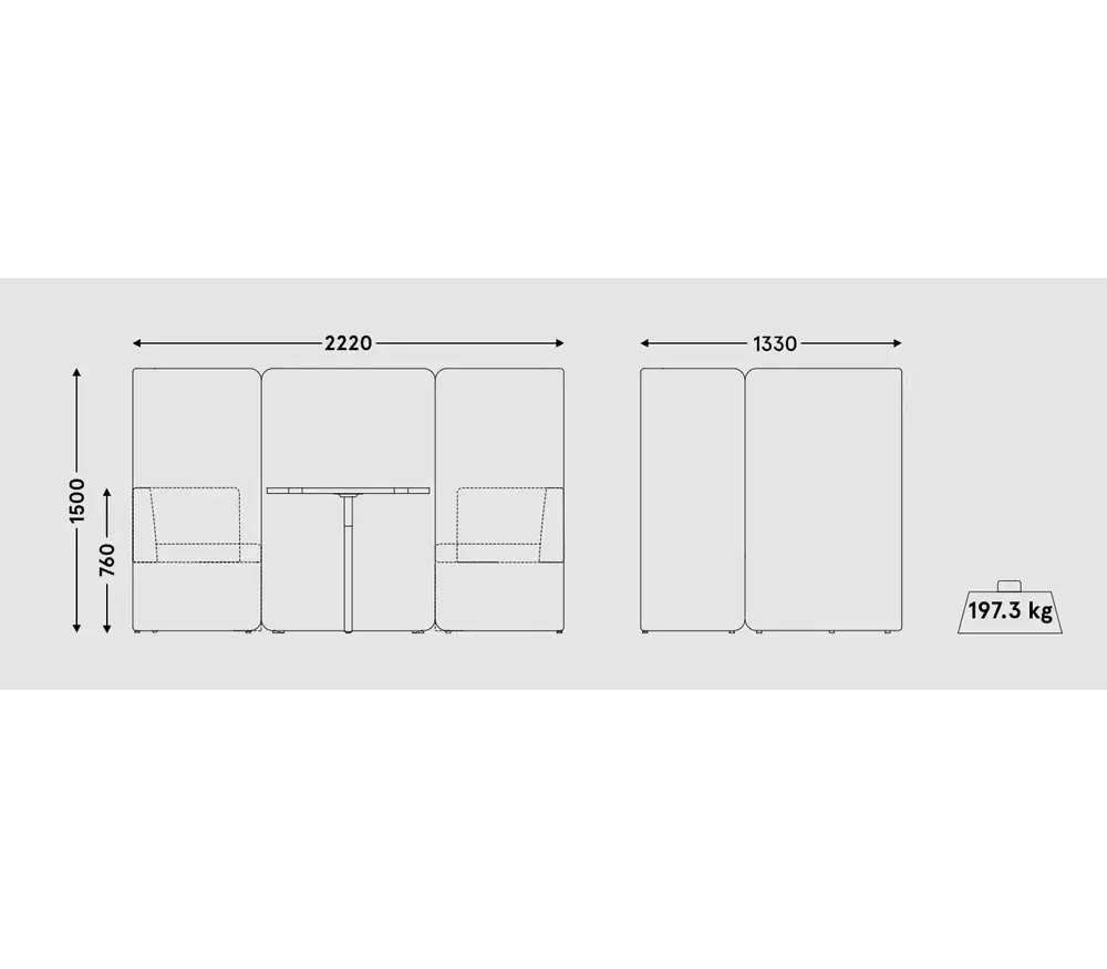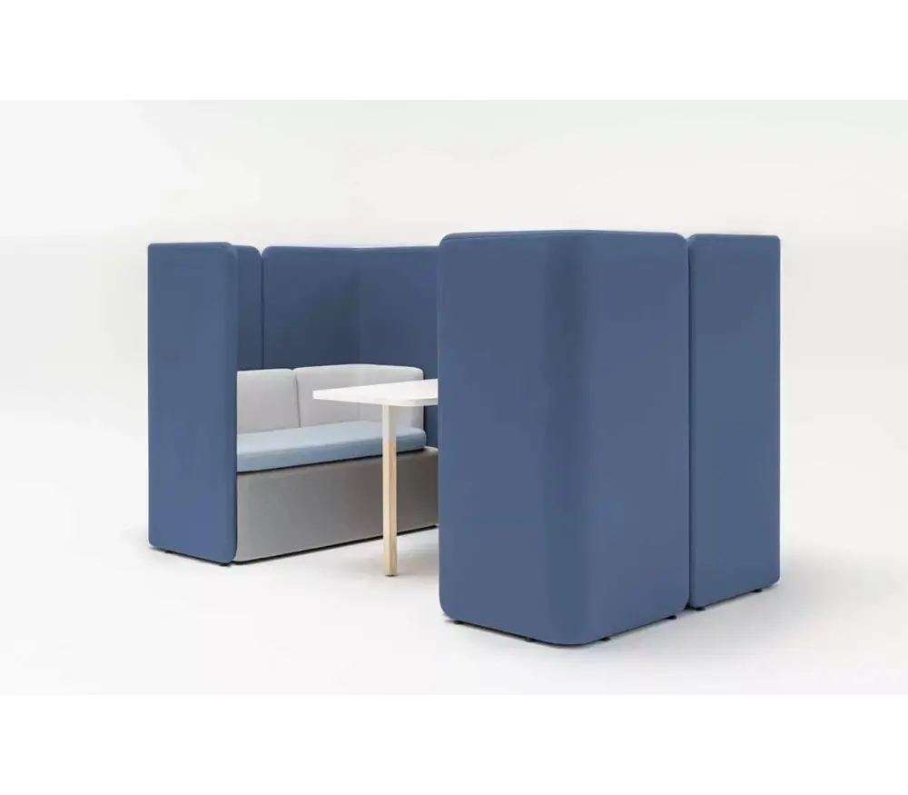 - Materiaal: akoestische wanden uit stof, banken uit houten frame gestoffeerd, tafel uit melamine met poot van alumimium Atlantic stof 100% Polyester(530/m2), BS EN ISO 12947-2, 110,000 Martindale cycles, Ontvlambaarheid (BS EN 1021-2 Match, CA TB 117-2013, BS EN 1021-1 (sigaret) Klasse Uno UNI 9175 Klasse 2, EMME), Medley stof 100% Polyester(510 g/lm) - Acoustic test sound absorption(ISO 354) - Ontvlambaarheid (BS EN 1021-2 Match, CA TB 117-2013, BS EN 1021-1 (sigaret) Klasse Uno UNI 9175 Klasse 2, EMME) of afwasbare Vita stof die bestaat uit 50%, Polyester 50% Katoen