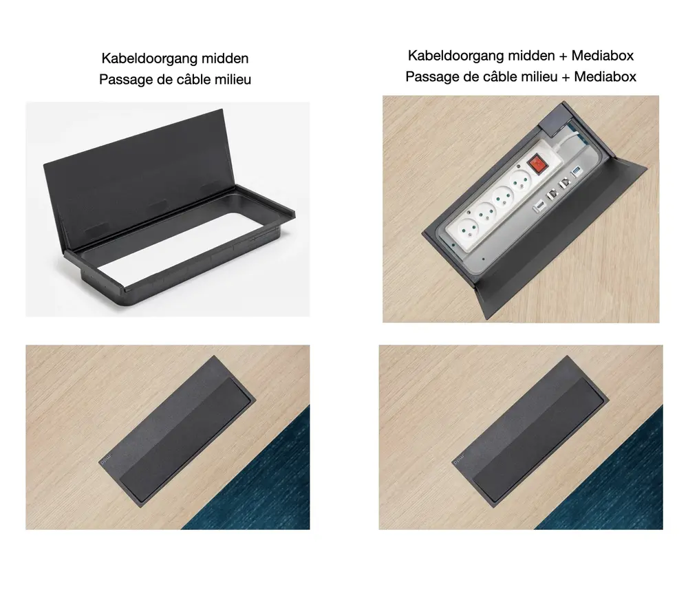 - Kabelmanagement optioneel: Kabeldoorgang midden (met klep in het midden van uw bureau), Kabeldoorgang midden +Mediabox(met klep in het midden van uw bureau + elektrificatie: (4x230V, 2xRJ45, 1xUSB, 1xHDMI) - Maar 1 kabeldoorgang per tafelblad mogelijk!