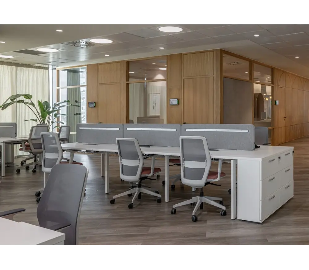 Met de geïntegreerde kabelgoten en optionele akoestische scheidingswanden creëert u een georganiseerde, stille en ergonomische werkplek. Ideaal voor een strakke, moderne uitstraling in kantooromgevingen.